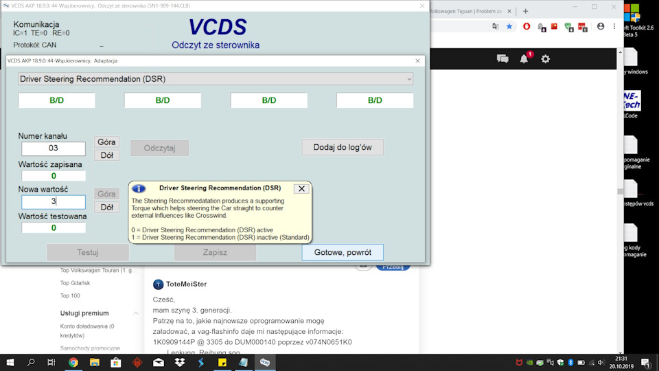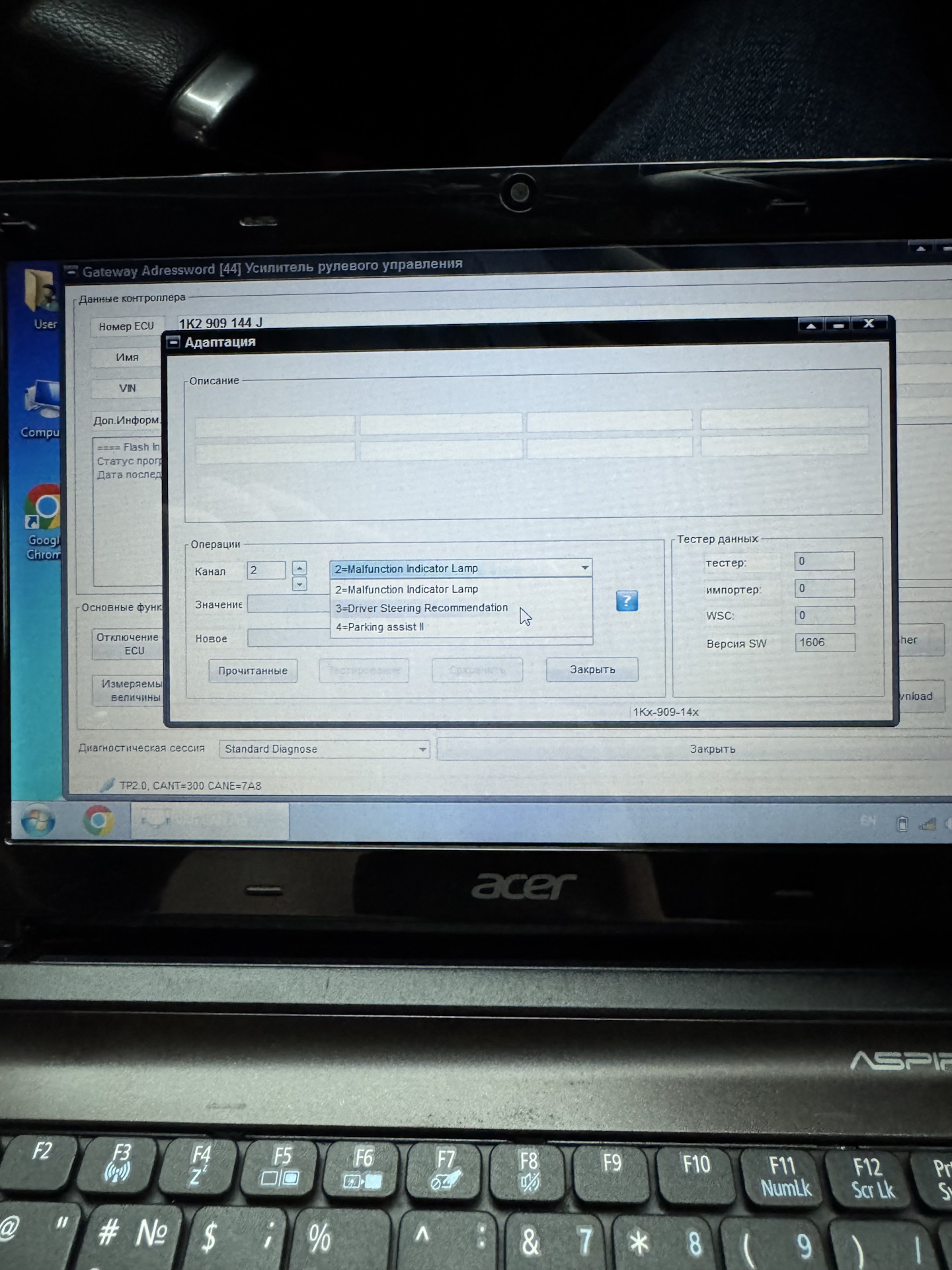 Если Вы выполнили шаг 1 и 2, то каналы адаптации у 44 блока слетают на дефолтные (по умолчанию). Восстанавливаем их… Заходим в адаптацию, настраиваем по желанию DSR, TSC, DCC. Обращаем внимание на последний пункт (9 канал) — Steering wheel angle sensor (g85) — этот канал указывает рейке, откуда брать данные с датчика угла поворота рулевого колеса. Если у нас рейка 3-го поколения, то ставим сюда 0. Если более раннего, то оставляем 1 — это укажет рейке, что датчик находится в подрулевом блоке.