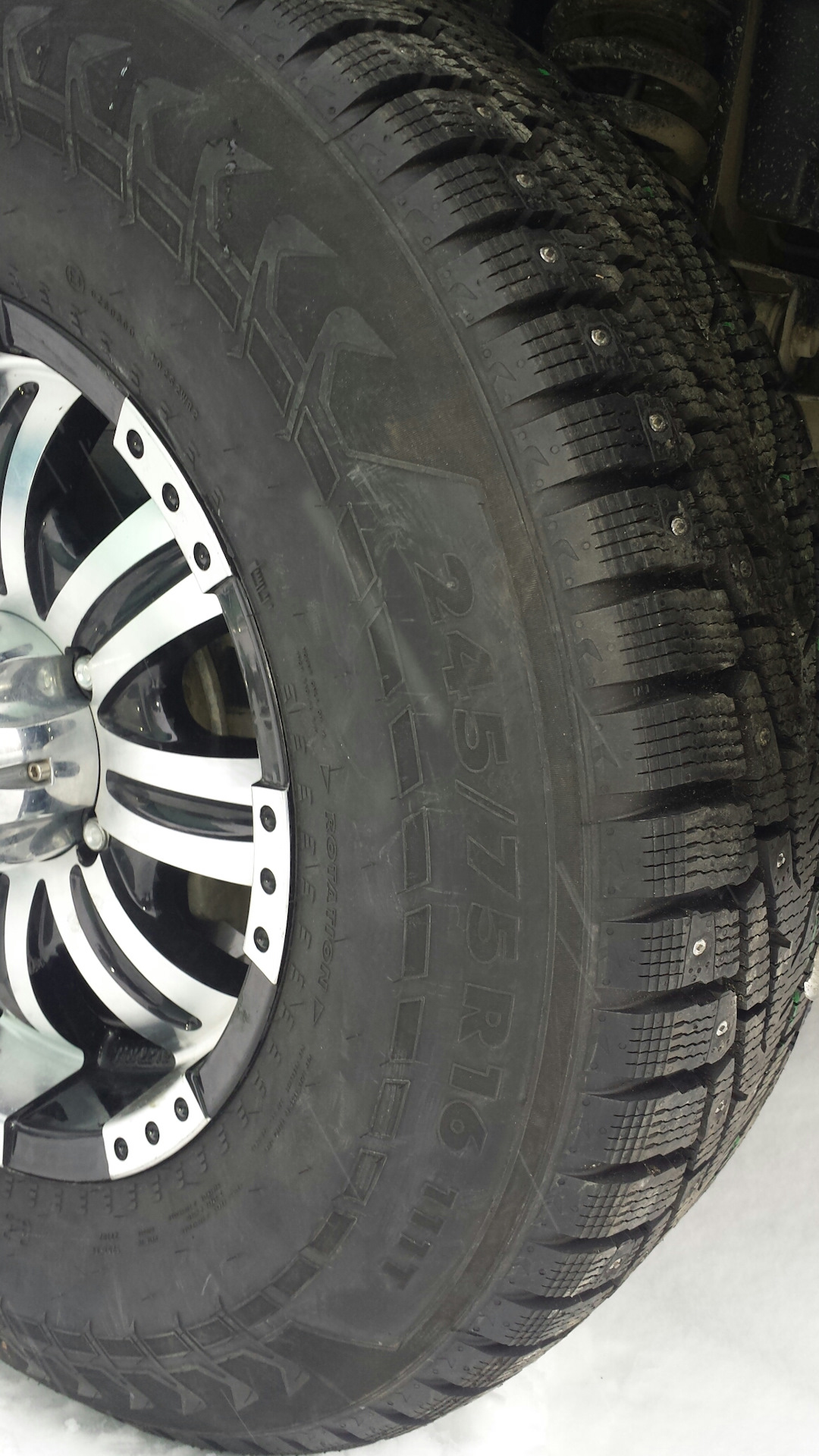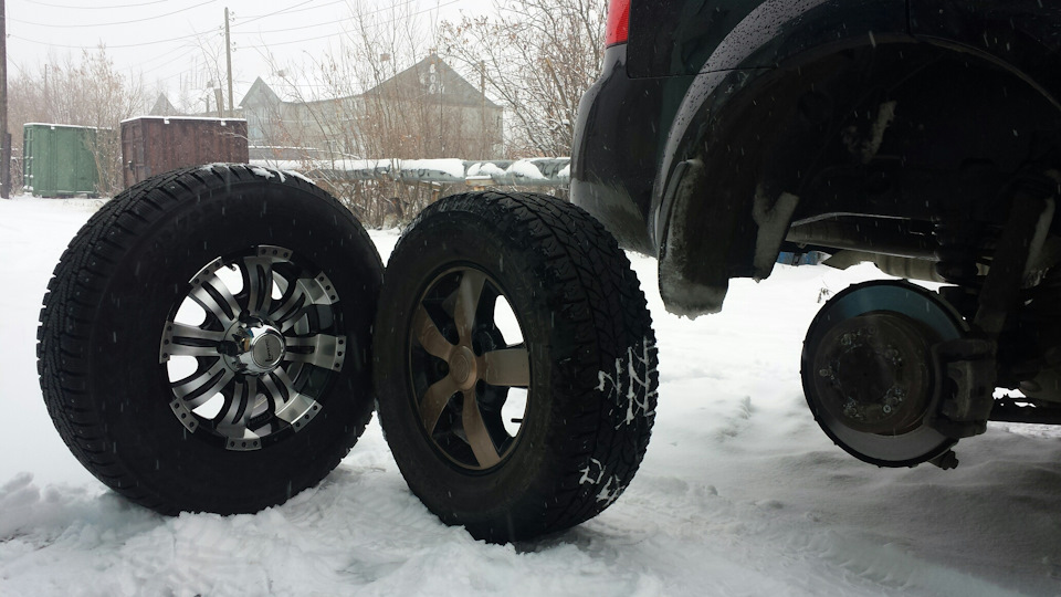 Ну вот и пришло время примереть шипованную резину. Две зимы отъездил на липучке. На эту зиму решил взять шипы, они всё-таки лучше цепляются за лёд. Резину взял в размере 245/75r16 хаккапелита 7.