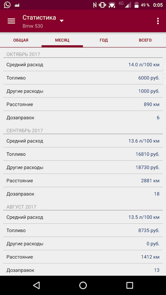 Методология: средние значения на основе данных за 4 месяца. Эти данные в удобном формате хранит мобильное приложение. После каждой заправки в мобильном приложении я указываю: сумма в российских рублях заправки, стоимость литра бензина АИ-95, показания одометра.