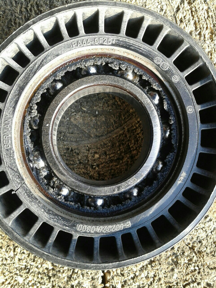 Еду я такой вечером домой, всё хорошо и тут резкий шум из под капота. Машина секунд через 10 глохнет, и больше не заводится :(. Отогнав в сервис обнаруживалось, что натяжной ролик ремня ГРМ развалился в хлам. Это привело к загибу всех 16 клапанов… Думал его вместе с ремнём и помпой менять на 60т но не дотянул. И подумать не мог что он на 45т развалится.