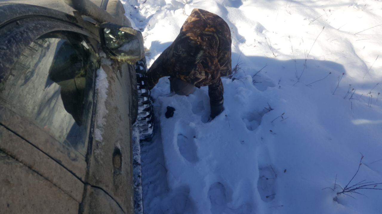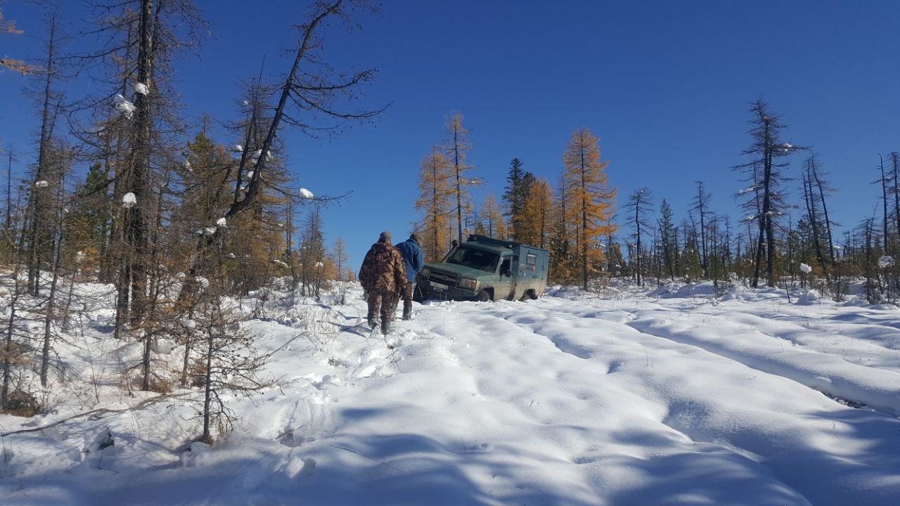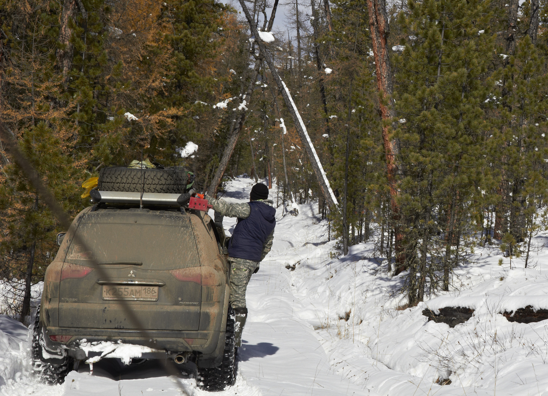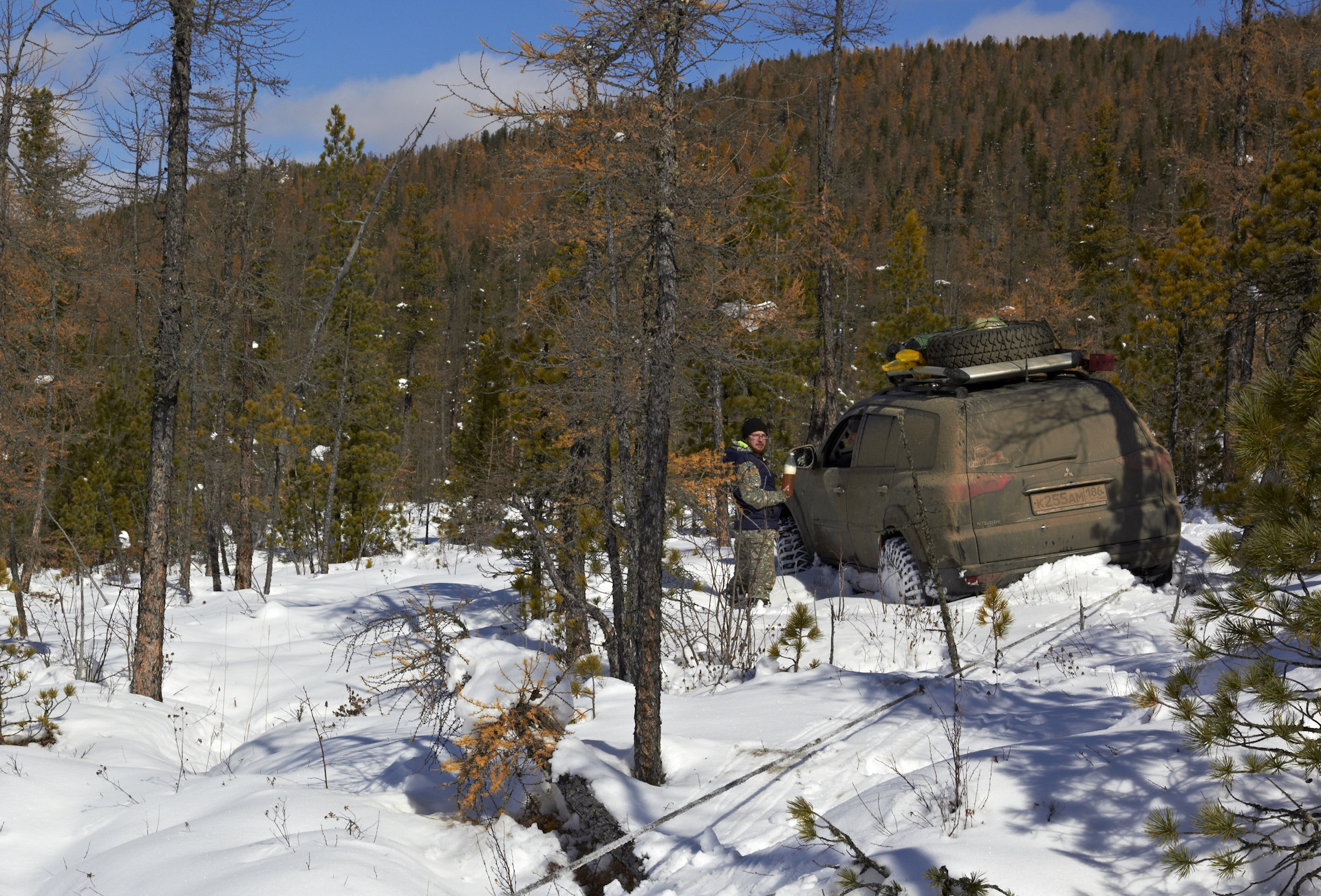Приехали, подумал я тогда, но на наше счастье лебедка вдруг ожила. Забегая вперед, скажу, что после, я открутил массовый провод от мотора и с него вытекло грамм 100 воды, видимо она ночью перемерзла и лебедь отказывался работать, а днем вода растаяла. Цепляемся за дерево, подтягиваемся и выезжаем. Володя едет позади метрах в 100. По рации сообщаю ему о засаде, и говорю чтоб искал объезд по лесу.