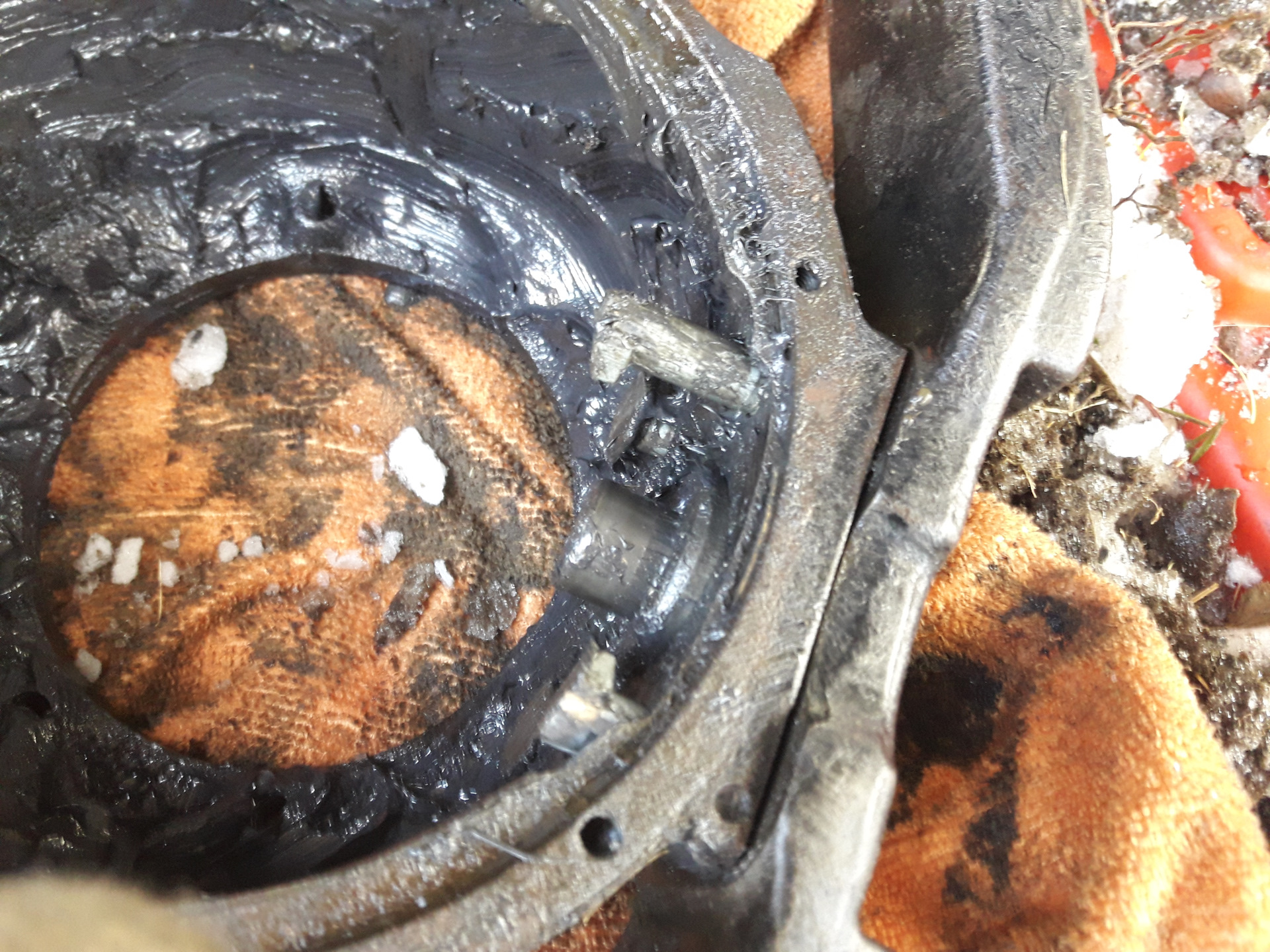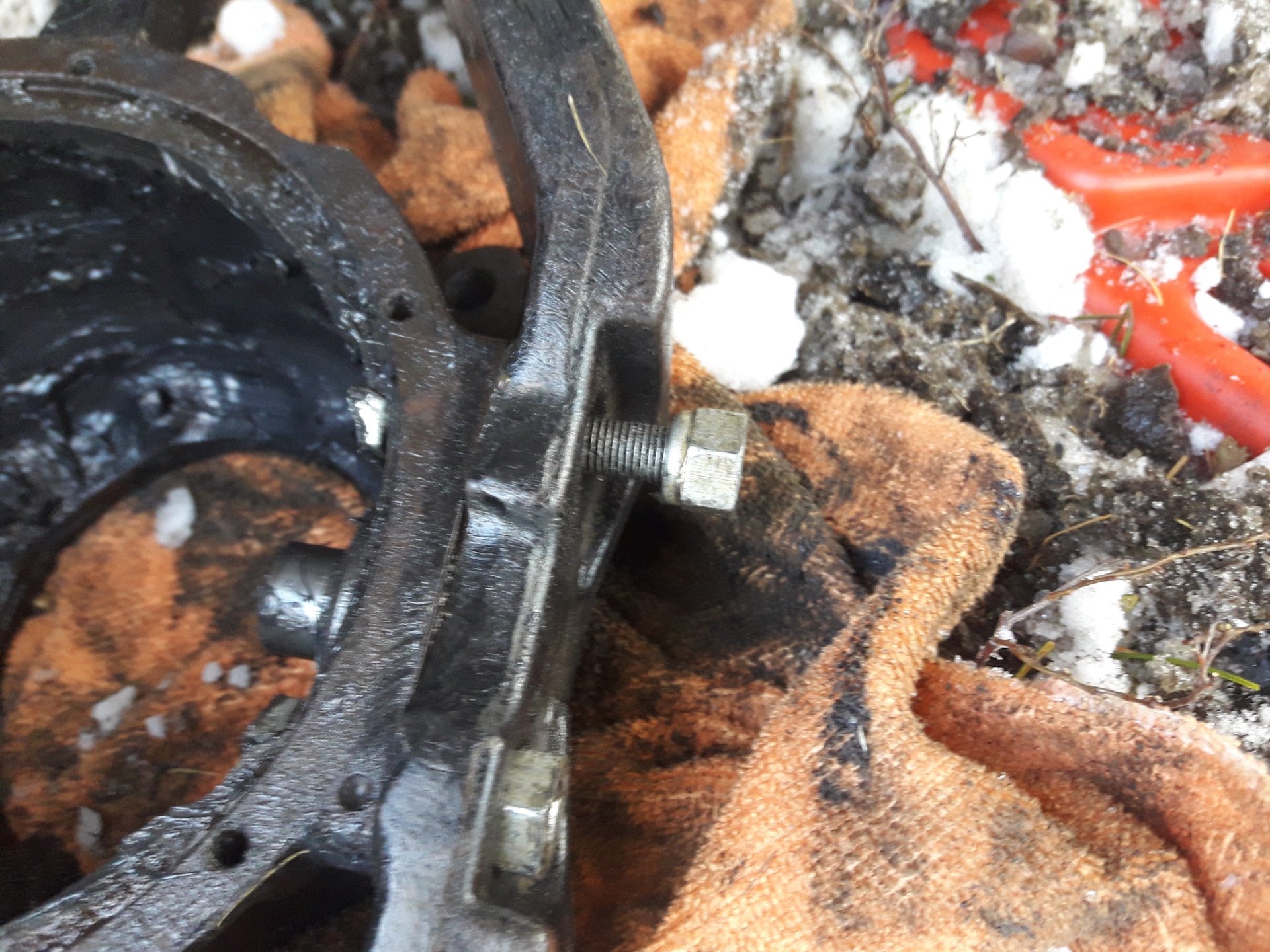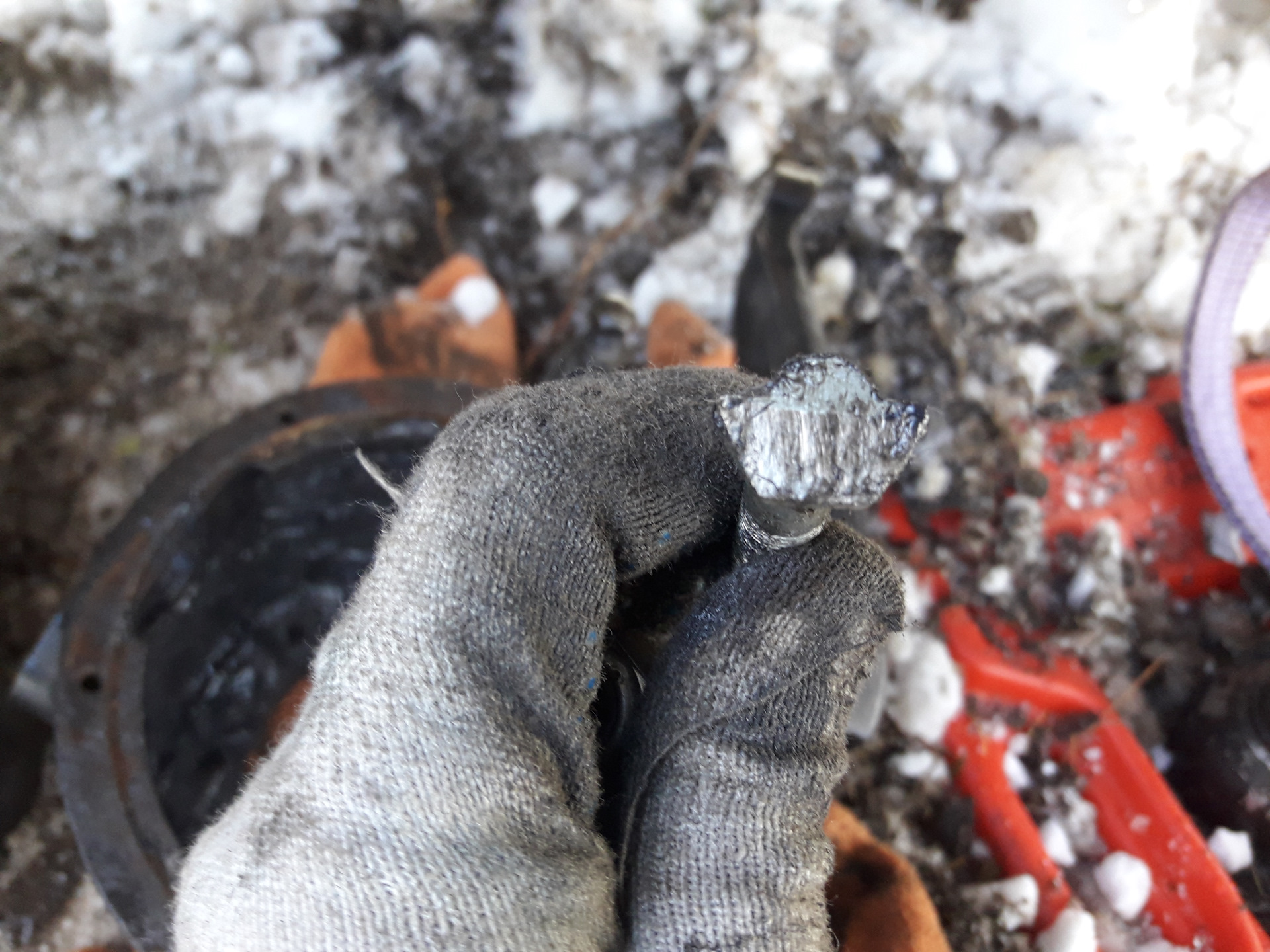 Зашибись… Разворачиваемся с Ванькой, протаптываем до Володи новую дорогу, так как колея, в которой мы только что сидели, не проходима в обратном направлении. И пока едем до него, перебираем в голове варианты, как от сюда выбираться… Подъезжаем к Володе, он уже поддомкратил машину, и выдает, сошка целая, но отломило шпильки крепления сошки, следовательно перестал держаться нижний шкворневой подшипник и вывернуло верхний шкворневой подшипник. То, что сошка целая, не может не радовать нас, быстро разбираем кулак, для оценки масштаба бедствия. ; шпильки отломлены, обломки в кулаке, раздавлены 2 ролика верхнего шкворневого подшипника, скол внутренней обоймы нижнего шкворневого подшипника. Скол обоймы вообще фигня, Раздавленные ролики подшипника — тоже не беда, удаляем обломки роликов, поправили сепаратор и пойдет. А вот со шпильками дела обстоят похуже, в ЗИП-е таковых нет. К тому же сошка прикручивается к кулаку через конусные втулки, а они тоже все потерялись… Выкручиваем обломки, шпилек из кулака, и тут новый сюрприз. Ни у меня ни у Володи нет подходящих болтов, а тем более шпилек, чтоб закрутить в кулак, у всех болтов не тот шаг резьбы… Приходится изобретать велосипед, осмотрели кулак, в области отверстий под шпильки изнутри кулака есть углубления, можно попробовать вставить болты изнутри кулака, получится примерно, тоже самое, что и со шпильками, только они будут на 10, а не на 12. Только нужно подрезать шляпки болтов, чтоб утопить их в углубления, и чтоб шляпки не упирались в шар моста. Благо подрезать шляпки болтов не придется руками, а у нас с собой есть болгарка.