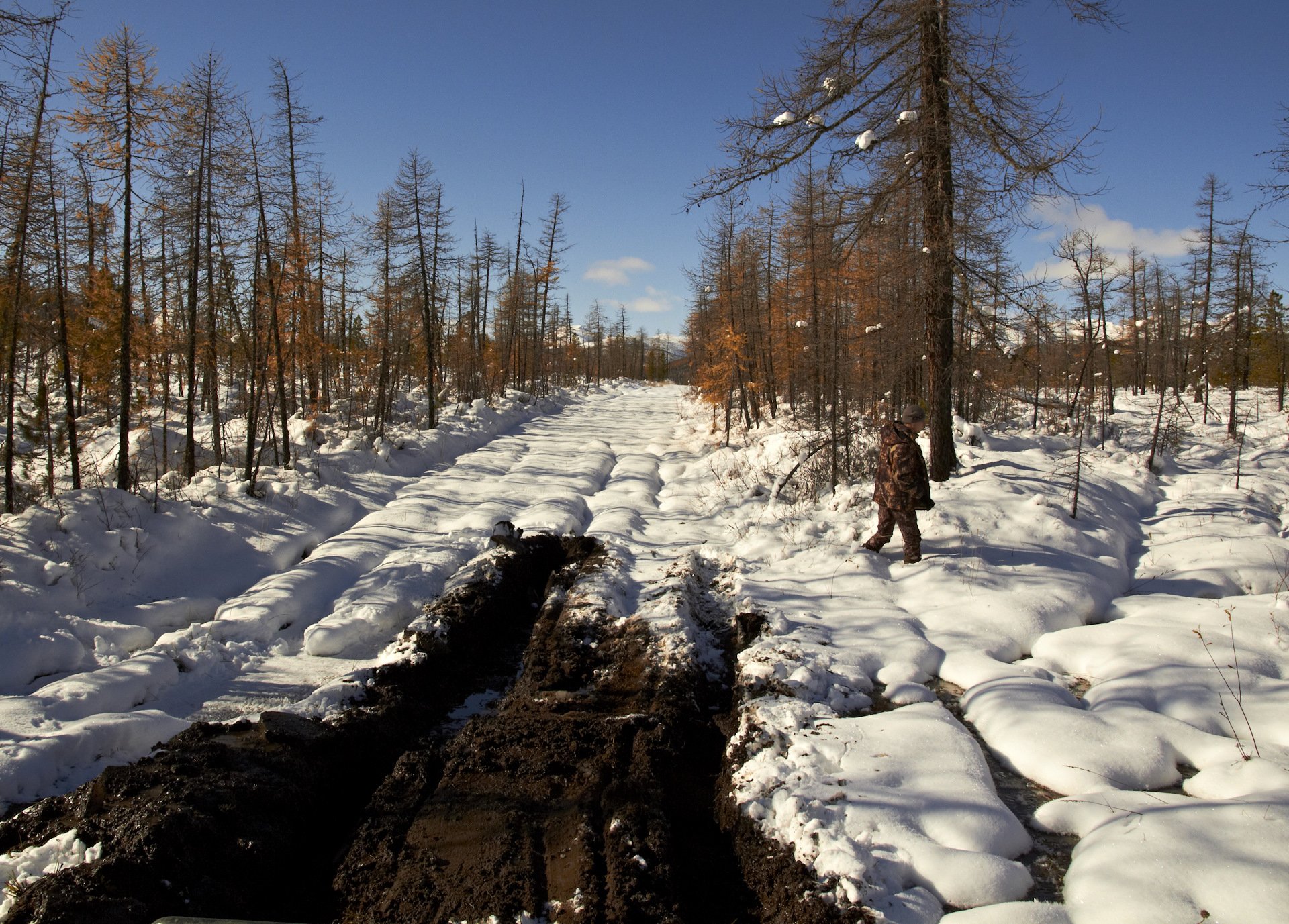 Пошли искать объезд, а вокруг от шагов все шевелится. Прыгнешь и прямо видно, как волна вокруг расходится и шевелит даже небольшие лиственницы))) Чуть правее показалось, что немного суше, сунулись туда. Володя идет первым, за ним в колее уже стоит вода, идти по его следу уже не вариант, приходится ехать в разрез колеи. Движение наше длилось не долго, вдруг Володя попадает толи в ручей, толи в колею и садится. Пробуем лебедиться за деревья, но грунт такой, что даже лиственницы с диаметром ствола сантиметров 15-20 легко выкорчевывается. Объезжаю Володю и встаю якорем. Пока вытаскиваемся, стою и размышляю, а ведь это мы лебедимся под гору, а что будет, когда поедем обратно, ехать-то будем в гору))) Но обратно разворачиваться не вариант, нам нужно вперед.