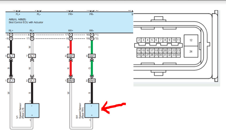 Прозванивать решил следующим образом: от ЭБУ ABS, до фишки под панелью (торпеда), само соединение и т.д. до следующей фишки. В моём случае это пины 16 и 17.