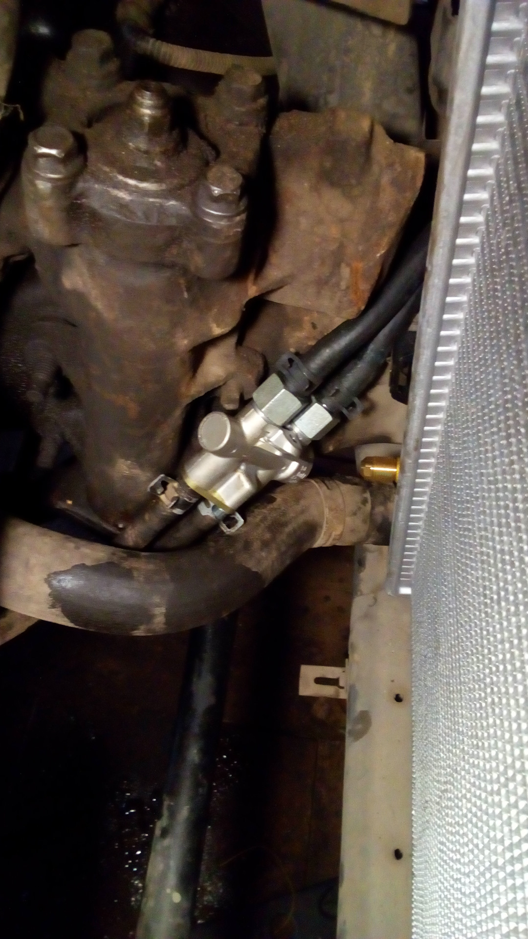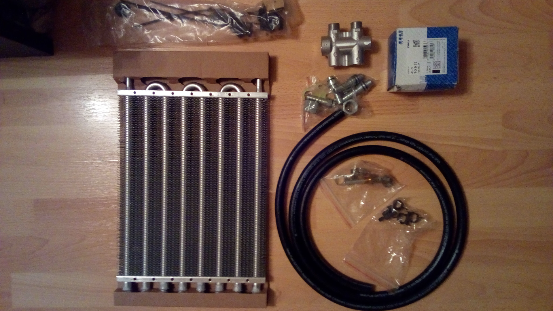 В дополнение к этому решил поставить 8-рядный допрадиатор АКПП (2800 руб), а вернее вынести его в отдельный контур. Для правильной установки дополнил его термостатом KNECHT/MAHLE TO975 (1371 руб.) и набором шлангов, хомутов и штуцеров (2000 руб).