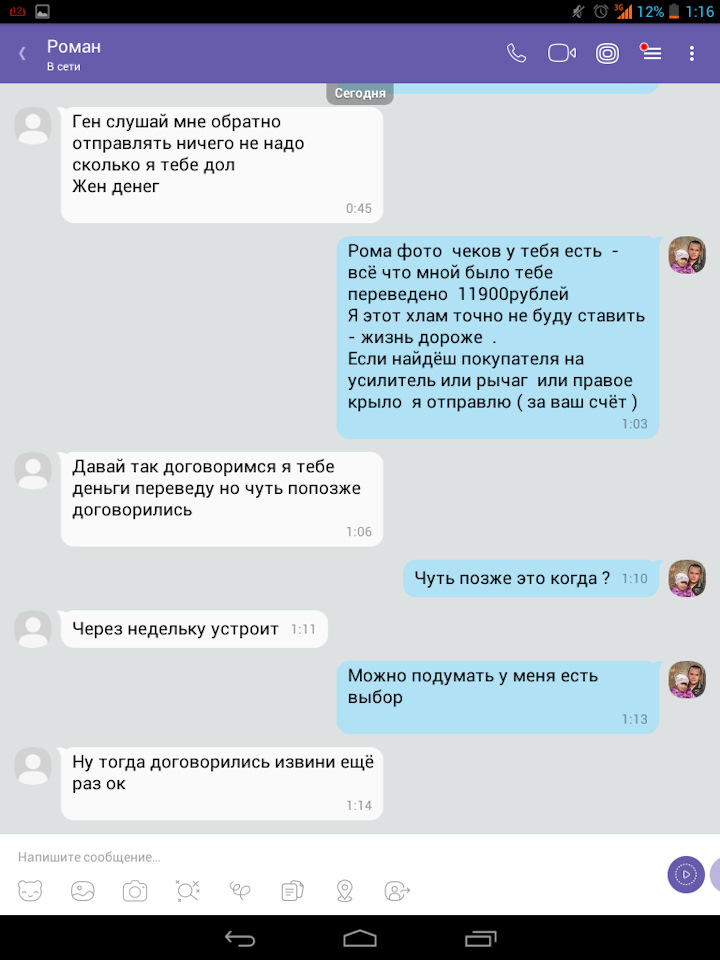 А причем тут мастер? Деньги то Ваши, про мастера роман поди и знать не знает). Не хочу никого обидеть, просто Вы заплатили за товар(причем сумма довольно приличная, чтоб просто огорчиться), заведомо некачественный(продавец знал о состоянии деталей), надеясь на сознательность продавца, который в свою очередь втюхал чермет. Здесь только два участника "сделки" и Роман поступил нечестно по отношению к Вам.
