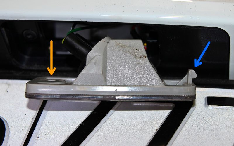![Плафон подсветки номера зафиксирован в крышке багажника саморезом [оранжевая стрелка] и Г-образным выступом [синяя стрелка]. При его снятии свободу маневров ограничивает рамка номерного знака — лучше ее демонтировать. Чтобы вынуть плафон, тянем его вниз со стороны самореза и одновременно — в сторону от выступа. — Hyundai Creta (1G)](https://a.d-cd.net/3ca6825s-960.jpg)