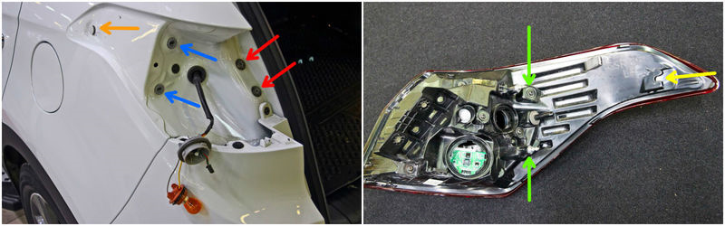 ![Крепления фонаря в крыле — на двух саморезах под крестовую отвертку или головку «на 10» [красная стрелка]. Два продольных направляющих фиксатора [зеленая стрелка] входят в отверстия в нише кузова [синяя стрелка]. Угловое ушко [желтая стрелка] садится на шляпку пистона [оранжевая стрелка]. Конструкция неплохо продумана, риск сломать крепления минимальный. — Hyundai Creta (1G)](https://a.d-cd.net/eca6825s-960.jpg)