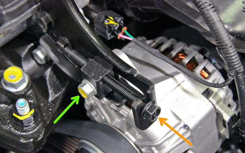 ![Регулировочный болт [оранжевая стрелка] механизма натяжения генератора — под головку «на 12», а контрящий [зеленая стрелка] — «на 14». На фото представлен вариант для модификации Креты с мотором 1.6 и электрическим усилителем руля. В случае с агрегатом 2.0 механизм регулировки расположен под генератором, доступ к нему не столь удобный. — Hyundai Creta (1G)](https://a.d-cd.net/f8a6825s-960.jpg)