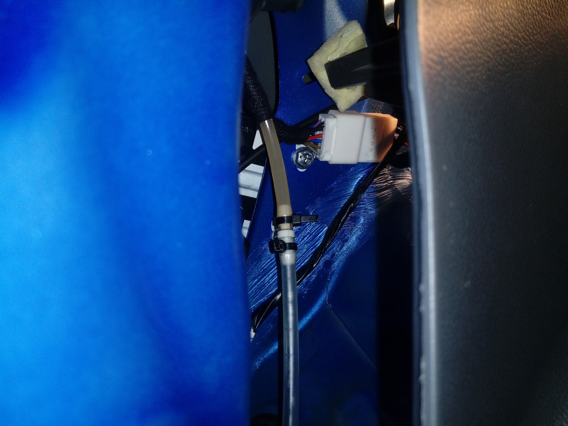 Открываем багажник и снимаем левую пластиковую облицовку на которой стоит подсветка багажника, сразу же видно нашу шлангу, с обоих концов затянул пластиковыми хомутами, попробовал то вроде держится.( у меня шланга была не до конца одета, но еще не текло, так что советую посмотреть) .