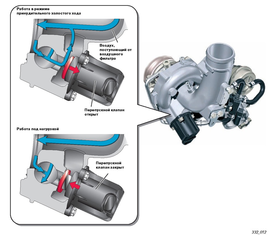 В режиме принудительного холостого хода дроссельная заслонка закрывается, под действием давления наддува в корпусе турбонагнетателя возникает динамическое давление. Из-за этого крыльчатка турбонагнетателя затормаживаться, что приводит к снижению давления наддува (эффект «турбоямы»). Для предотвращения этого эффекта электрический исполнительный механизм открывает перепускной клапан турбонагнетателя N249. Клапан, в свою очередь, открывает отводной канал, через который сжатый воздух от турбины снова направляется к входному контуру турбонагнетателя. Благодаря этому обороты турбины поддерживаются на требуемом уровне. При открытии дроссельной заслонки, перепускной клапан N249 закрывается, и давление наддува, которое обеспечивается раскрученной турбиной, может использоваться для работы двигателя.