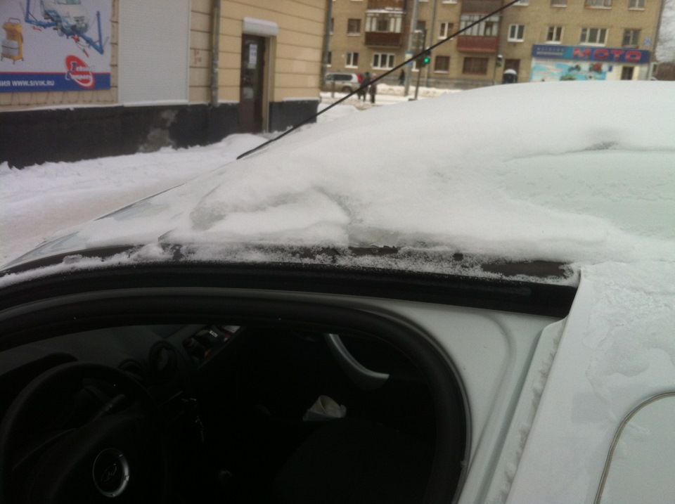 А на Калине еще хуже. У нее нет на крыше такого классного профиля с буртиком, там весь снег сразу на сиденье летит.