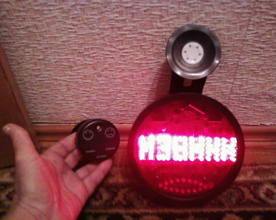 У меня стоит такая приблуда. Световое табло на батарейках. Пульт впереди на стекле, дисплей на заднем и показывает: Сенькью на ангийском яз, Извини, Догони и 2 смайлика_ улыбка и огорчение.