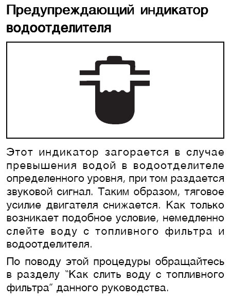 Первый раз за всю историю наблюдений загорелся у меня индикатор воды. Инструкция сообщает, что необходимо сразу же остановиться и опорожнять сепаратор с фильтром. Да еще и мощность двигателя снижается.