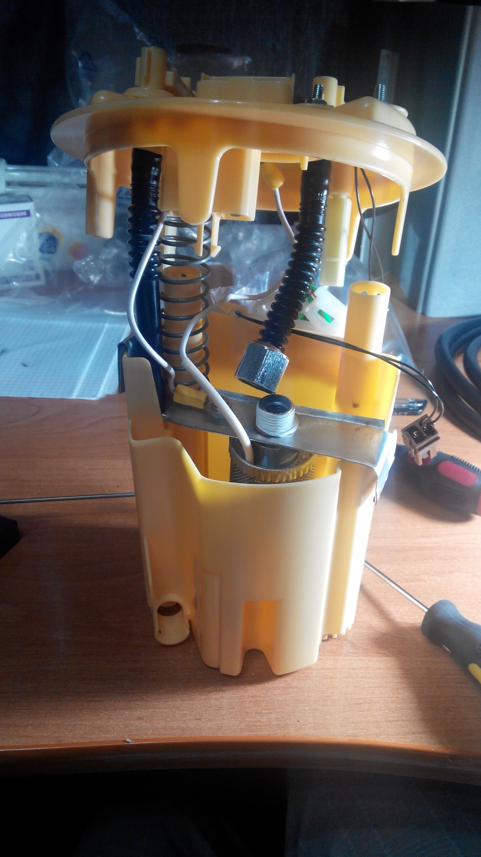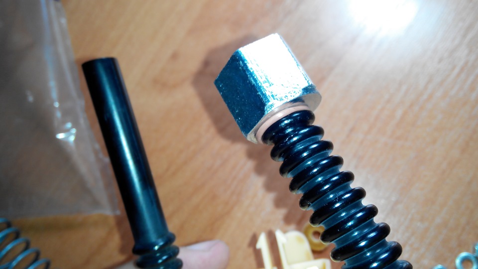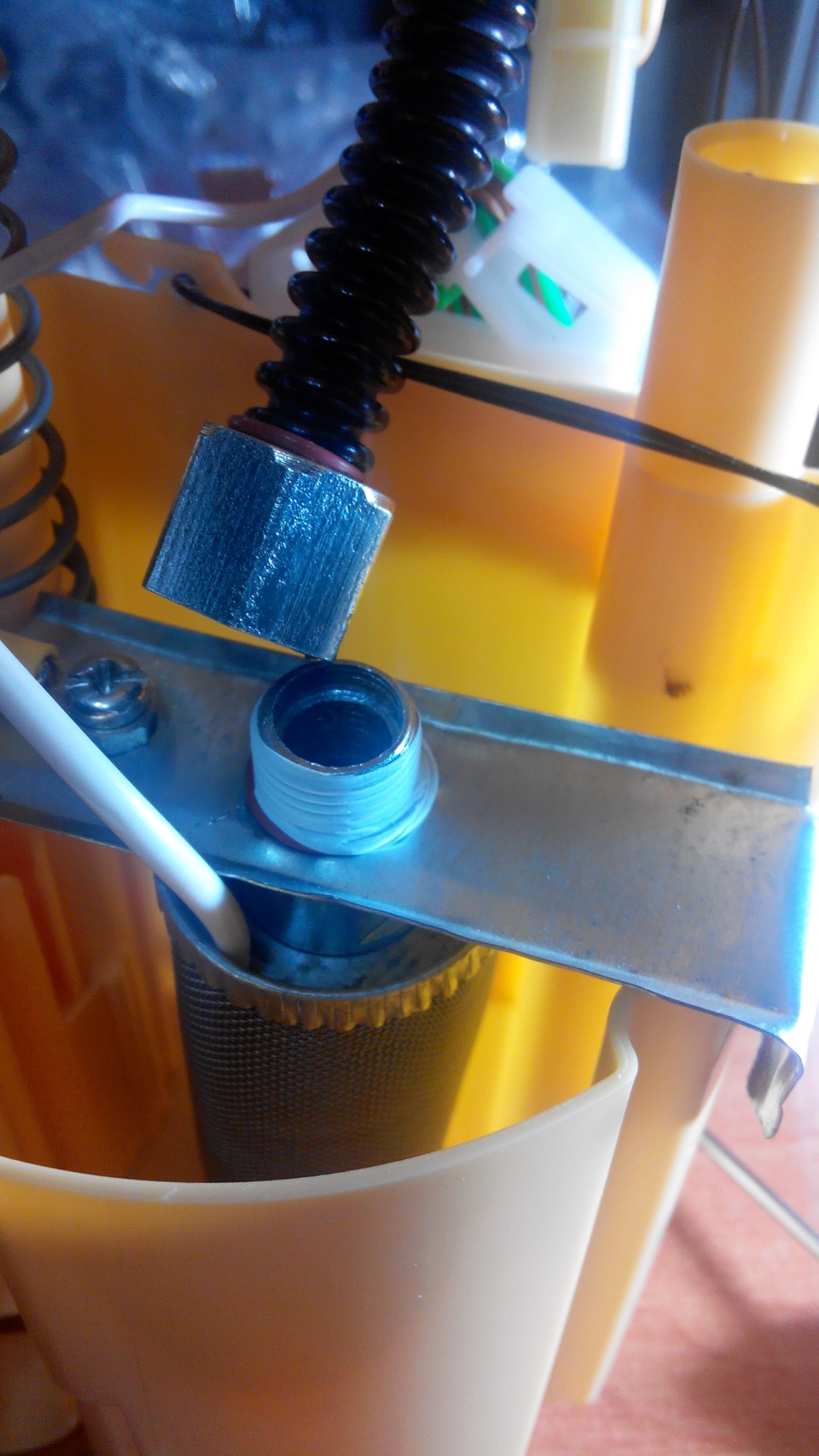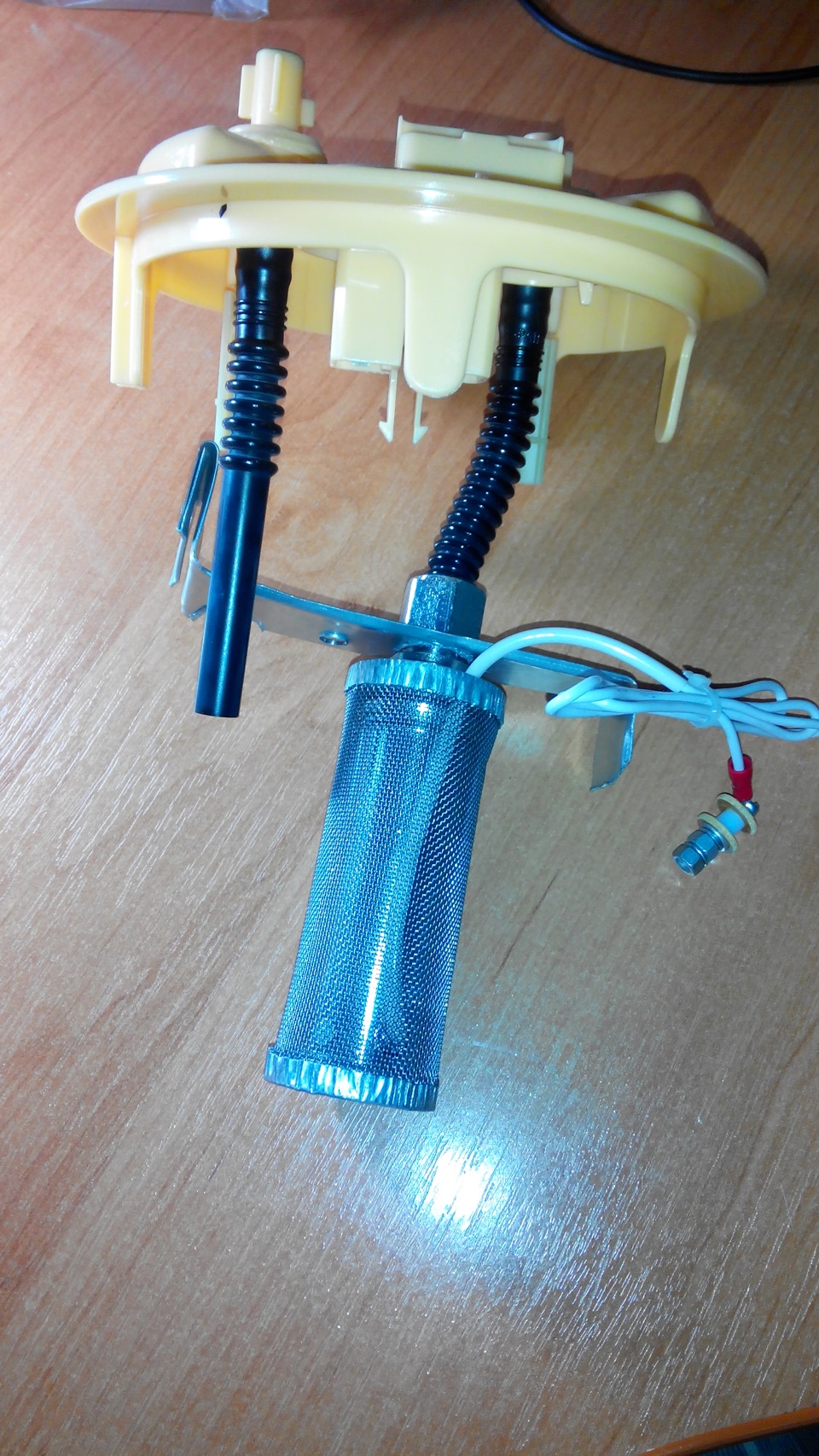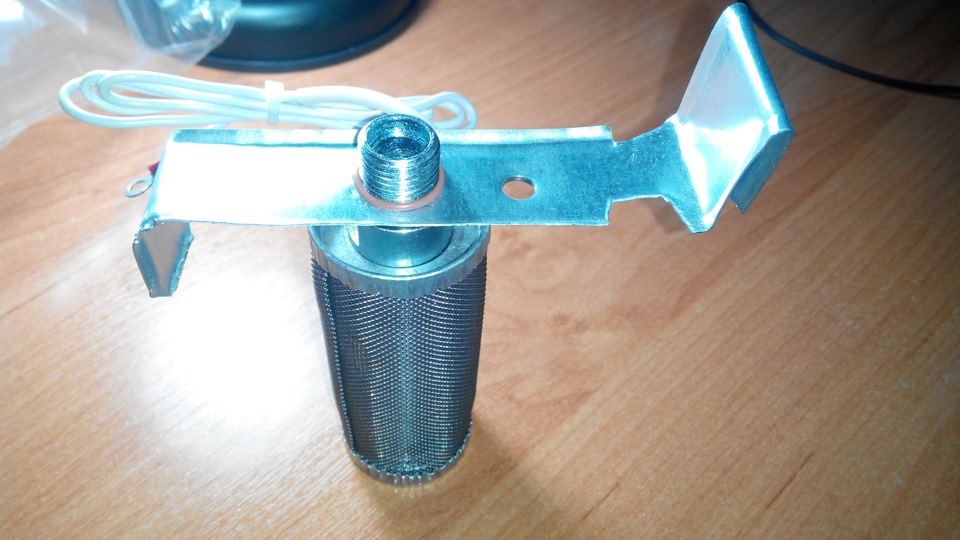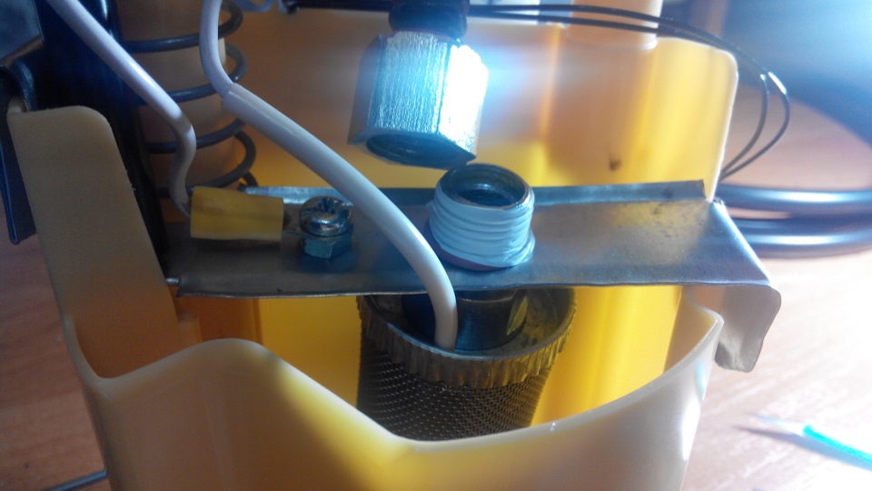 Далее начались раздумья как это все собрать воедино. В стакане заборника сетка была полностью удалена, а заборная трубка укорочена. Гайка подогревателя была установлена между ребрами трубки, по обоим сторонам установлены резиновые прокладки из маслостойкой резины.