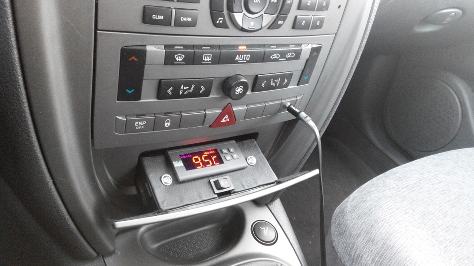 Очень сложно было вырезать в пепельнице место для установки термостата и проводов, т. к. там все элементы подогнаны очень плотно и материал довольно жесткий — все выжигал паяльником. Далее из куска пластика была изготовлена и обклеена кожзамом панель, установлена кнопка вкл/выкл. Все было закреплено болтами и установлено на автомобиль. Вся проводка была обмотана велюровой изолентой и проложена за панелью.