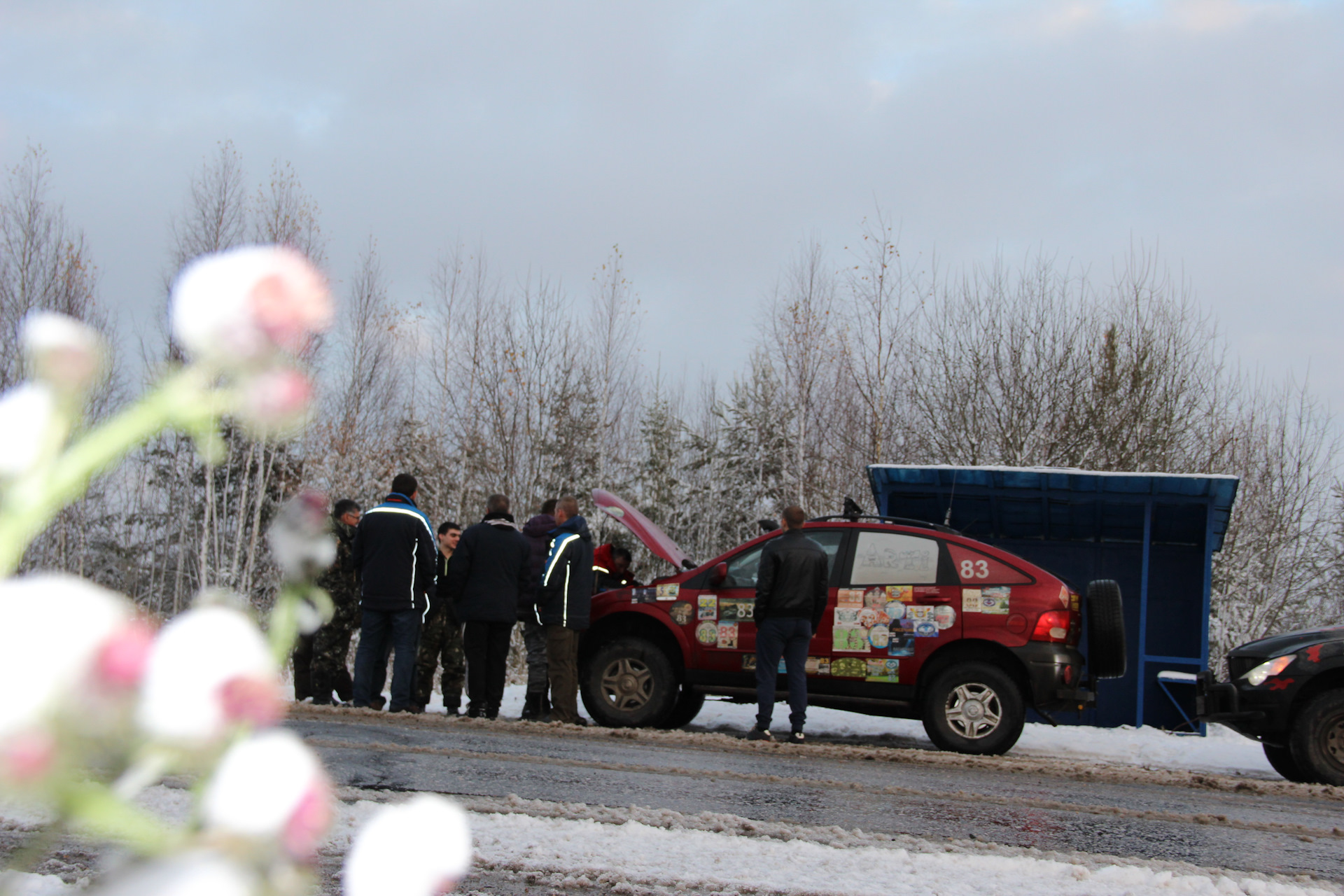 Так как ремонт моста в Костроме вопреки обещаниям не был завершён до 1 ноября было принято коллегиальное решение ехать через Ярославль (хорошая дорога)-Любим (тоже вполне хорошая дорога) — Буй (плоха дорога) — Галич (вообще дороги НЕТ!) — Чухлома. И всё, мы в Чухломском районе, ещё чу-чуть и будем в лагере — а нет! Аркаша показывает чекЭнджин и отказывается бодро ехать, смотрю ошибку — 1235. Патрубки все на месте, меняем модулятор, скидываем ошибку и Аркаша снова в строю. Данна проблема у нас появилась и позже — в первый ходовой день. подтянули патрубки, сбрасывали ошибку, меняли модуляторы, но проблема появлялась опять и опять, пока не поставили новый (не восстановленный) модулятор. Пока разбирались с проблемой встретили первых знакомых куролесов (Игоря Бубу и Рому ака Roman-SY на ромбике).