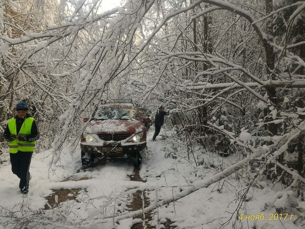 Первое лебежение у нас было на красном пунктире, нет бы кому-то из команды сказать "Саш давай я первый поеду, у меня же резина получше, а ты подсказывай направление." Но нет все "монстрики" нашей команды аккуратно ехали по следам, которые оставались от Аркаши. Болото долго искать не пришлось. Кусты, спуск, под снегом ничего не видно, леве/правее — всё СИДИМ на пузике! Тестирование лебёдки прошло удачно, кЕтайский трос не порвался при лебежении, что придало уверенности в возможности почаще заезжать на красные маршруты.