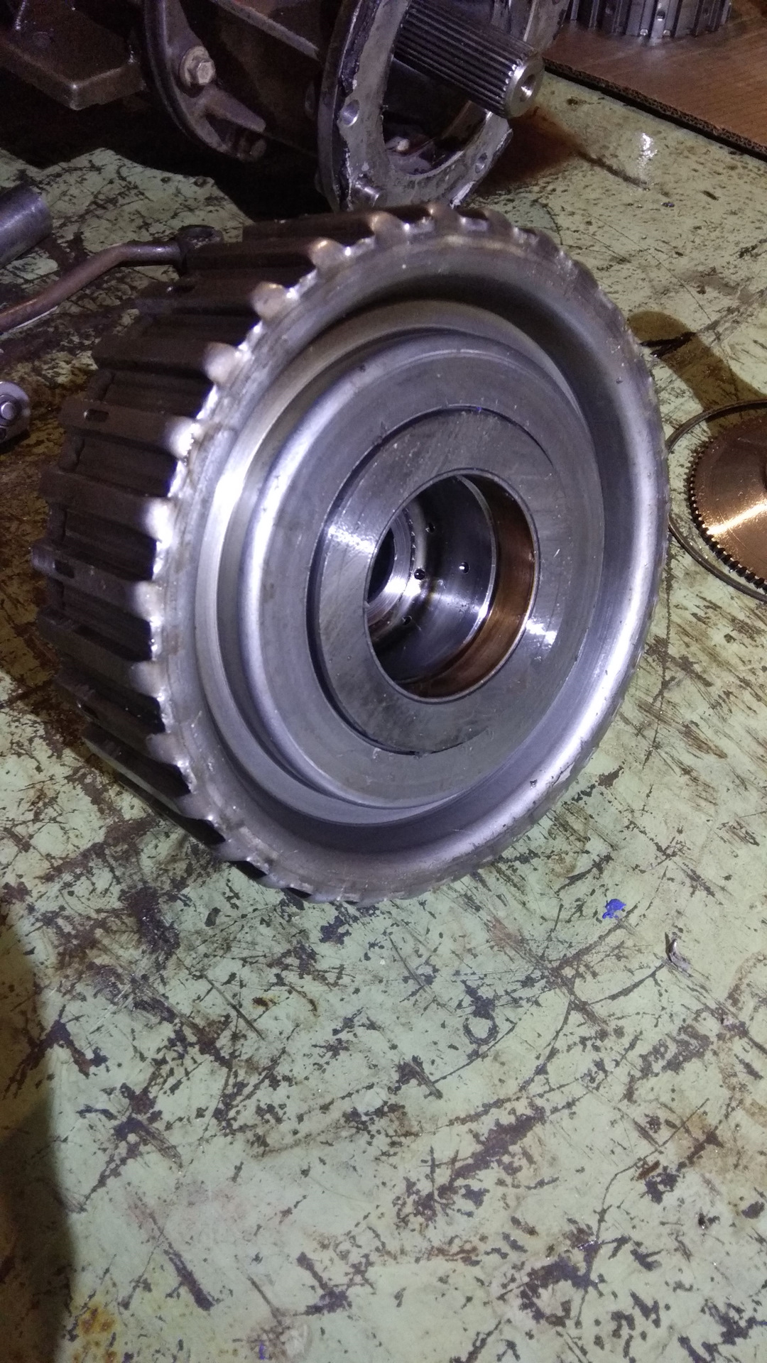 Разъединить не могу. Ось сателлитов одна провалилось. Все заклинило. Зубья на венце посрезало. Везде куски застывшей оплавленной пластмассы видимо от обгонки. Состояние ее не могу оценить — не могу долезть до нее.