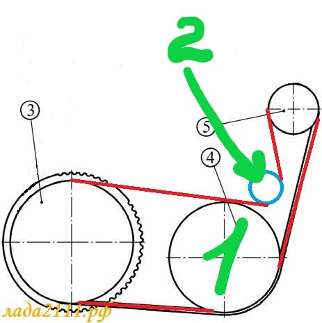 У меня тоже ремень 1080 бежит уже 65.000км. НО! Уже тысяч 20 еду с подвыванием, что только не менял, заменил генератор, натяжной, ГРМ, помпу, подшипник кондера, звук ни на йоту не изменился, грешу на ремень(может задубел и стал звук издавать), у тебя не было такого? Грешу на место (между шкивом компрессора кондиционера №1 на рисунке обозначил зеленым) и роликом натяжным, обозначил №2 ремень между ними ощущение что как впритирку идет.