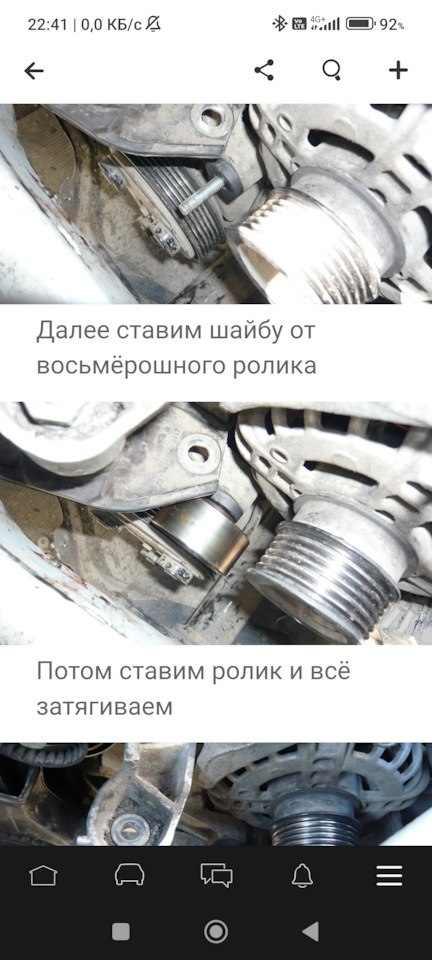 Ну просто задолбал меня скрежет ремня что при проезде луж, что при включении муфты компрессора… Менял два раза ремень на разных производителей, не помогло. Помогала лишь натяжка ремня в струну, но как-то жаль подшипники… Повторил доработку. Ролик взял тот что указан, но аналог от Fenox, ремень Dayco 6РК1080. Болт М8 купил от стойки стабилизатора дэу нексия с классом прочности 8.8, укоротил, в комплекте с ним была втулка с диаметрами соответственно 10 и 8мм, её применил для компенсации разности диаметра болта (8 мм) и отверстий в ролике и шайбе ГРМ 2108 (отверстия 10 мм) отрезав кусочек нужной длинны. Ещё пришлось подложить дополнительную шайбу толщиной 3 мм дополнительно к шайбе ГРМ 2108 — ремень лежал не всей шириной на ролике. Натяжка ремня получилась не очень сильная, это при положении генератора ближе к радиатору, но и видимо вполне достаточная для того чтобы избавиться от этого надоевшего скрипа ремня. Генератор Прамо, диаметр шкива 51 мм.С заменой ремня теперь проблем нет, но снимать ролик немного неудобно, да и думаю не так часто это потребуется… Считаю эти мелочи никак не перекрывают плюсы этой доработки. Большое спасибо за статью!