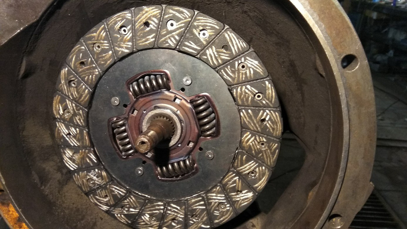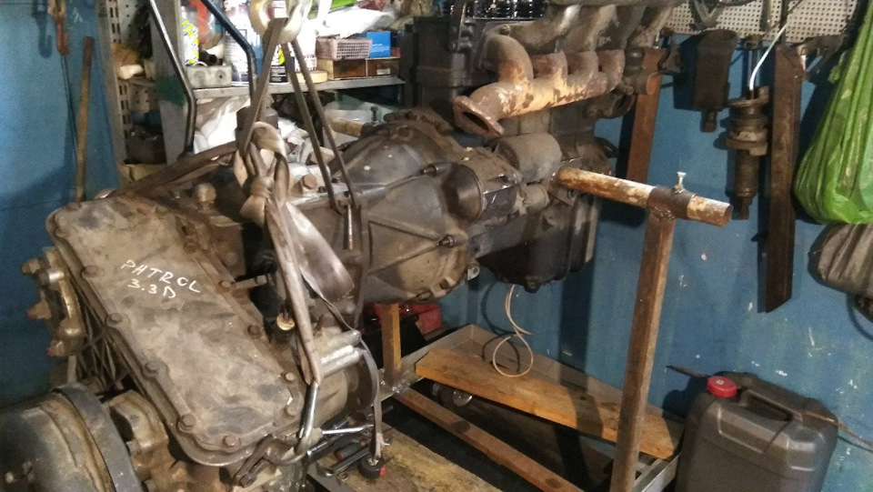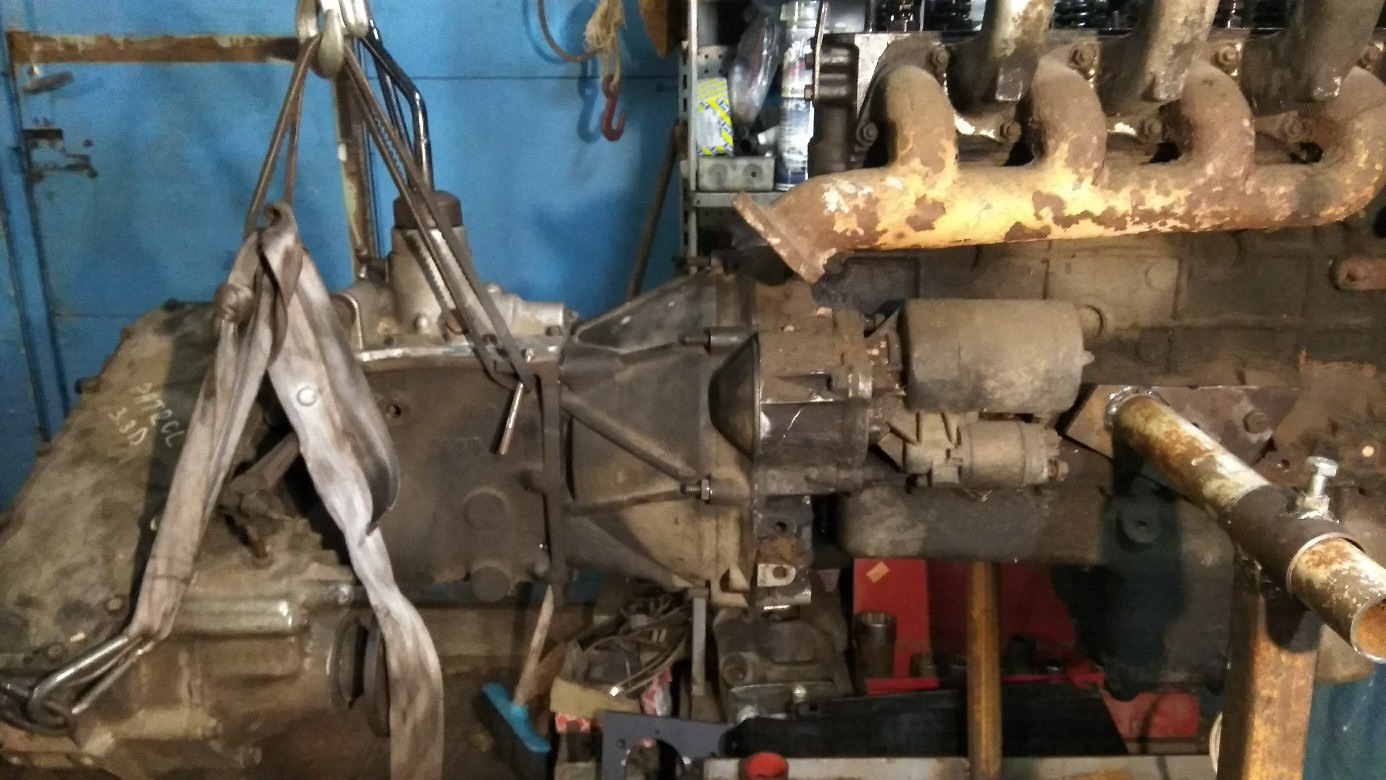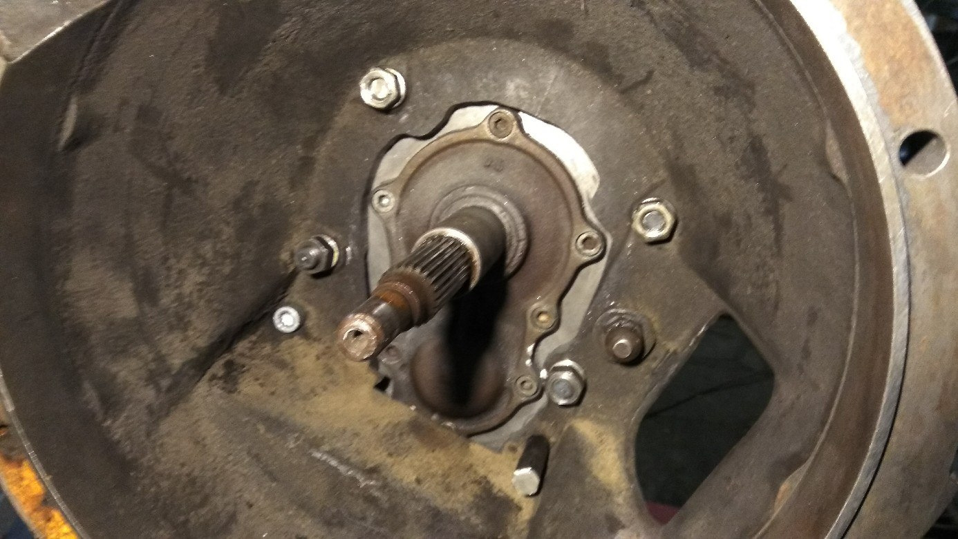 При сборке и промерке стыковочных размеров на КПП с переходной плитой выяснилось, что первичный вал мало выступает и шлицы недостаточно входят в диск сцепления. Родилась идея вообще отказаться от переходной плиты и присобачить коробку Патруля напрямую к колоколу Андории. На этот раз все получилось нормально и правильно.