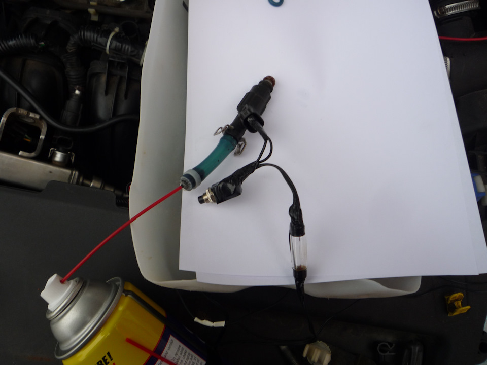 Для этого у меня вот такой очень сложный прибор это карбоклинер, изолента и трубка с мото-бензо-шлангом., и провод с крокодилами и разьемом от компа с кнопой в разрыв и в + впаяна лампа салона (искючает пиковые токи ) что бы соленоид форсунки не сжечь, выглядит это так: