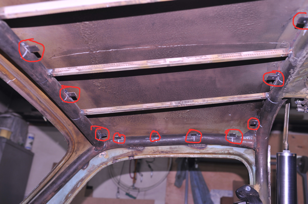 Итак, приступаю, напомню, что я сделал дополнительные усилители к которым потолок (из ДВП 3,2мм) будет крепиться клипсами. Решил остановиться на ДВП, как-то по народному что-ли! Напомню между металлическим потолком и из ДВП будет зазор порядка 40мм, ее я пуще на шумку, звукоизоляцию и всяким музыкальным делам. Одних усилителей мало и по периметру я приварил дополнительные крепежи для клипс. На фото они выделены красным цветом:
