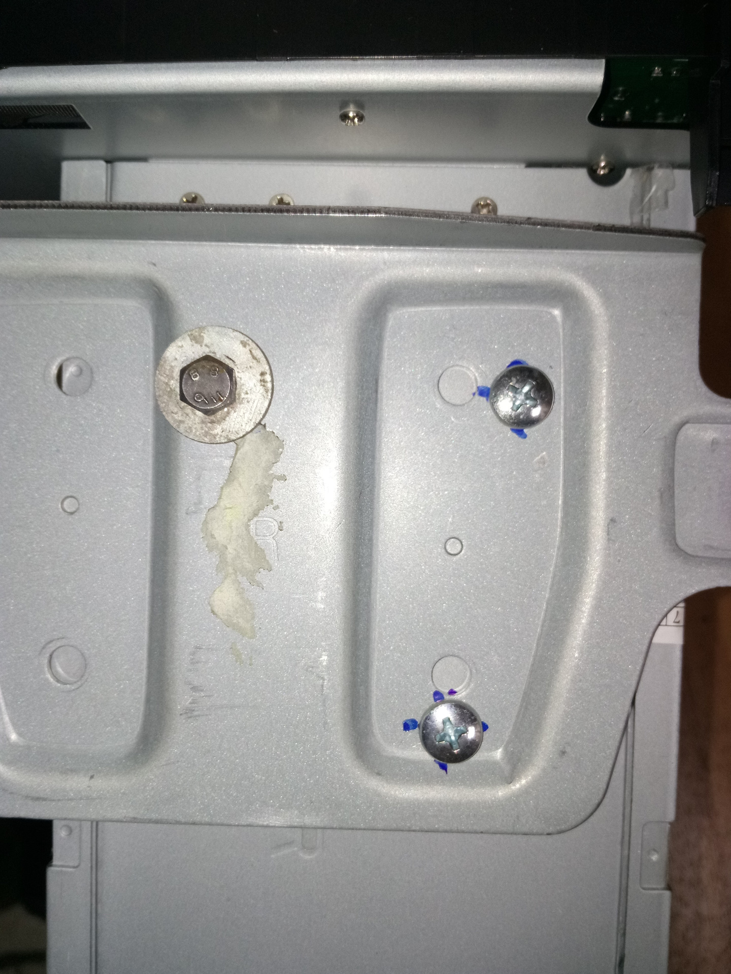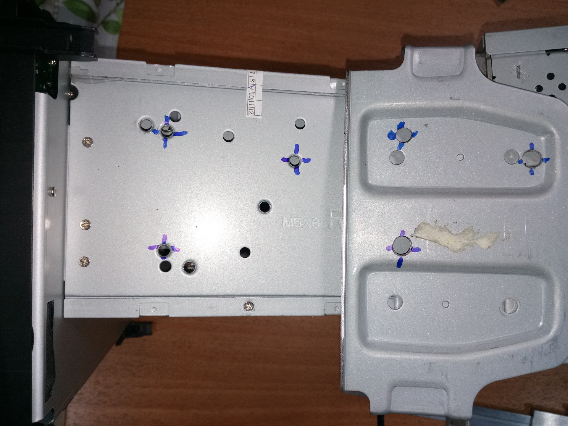 Вместо 4-х родных, сделал три отверстия вполне достаточно! Это уже с другой стороны, привязку делал аналогично той стороне, болт который на выпуклости пришлось подобрать шестерку в коллекции болтов в гараже по длиннее, а чтоб не вошел глубоко в магнитолу, подложил шайбу.