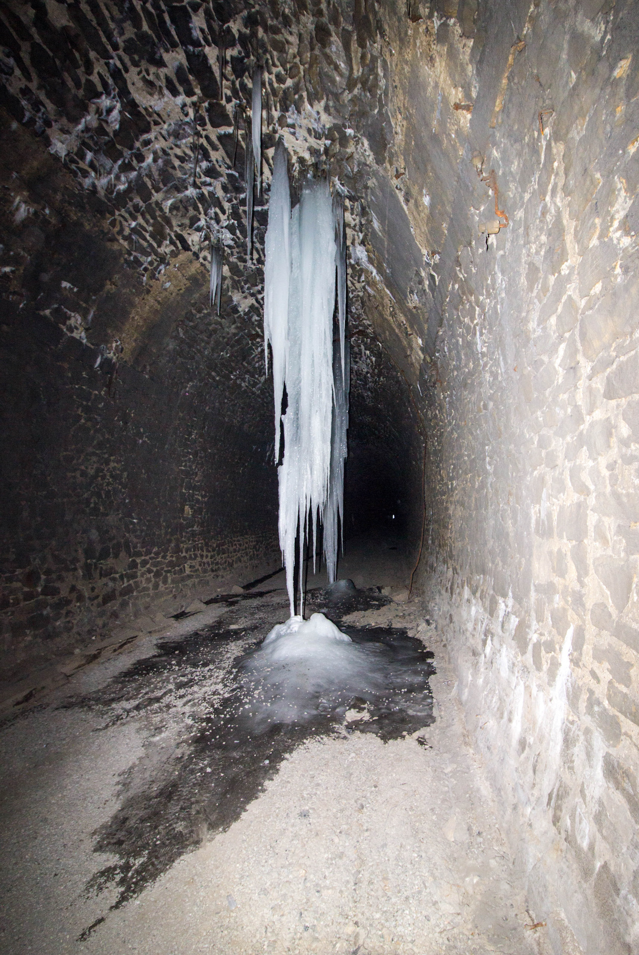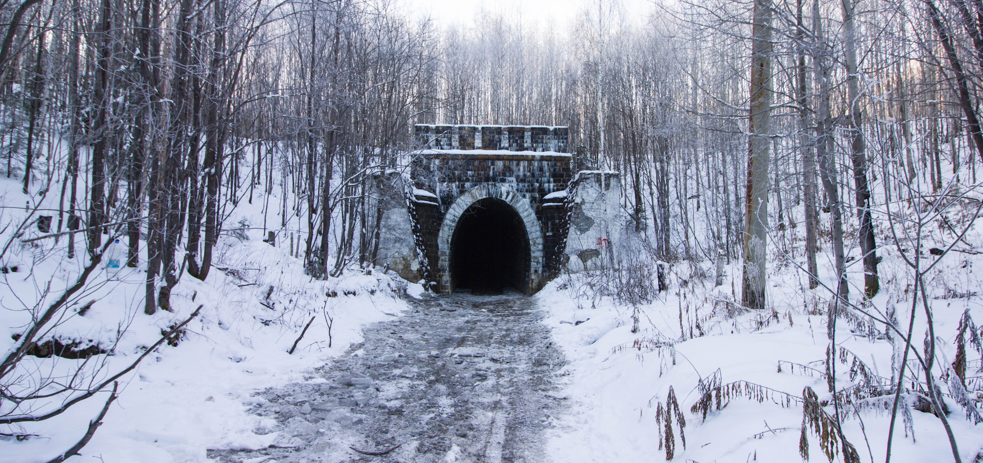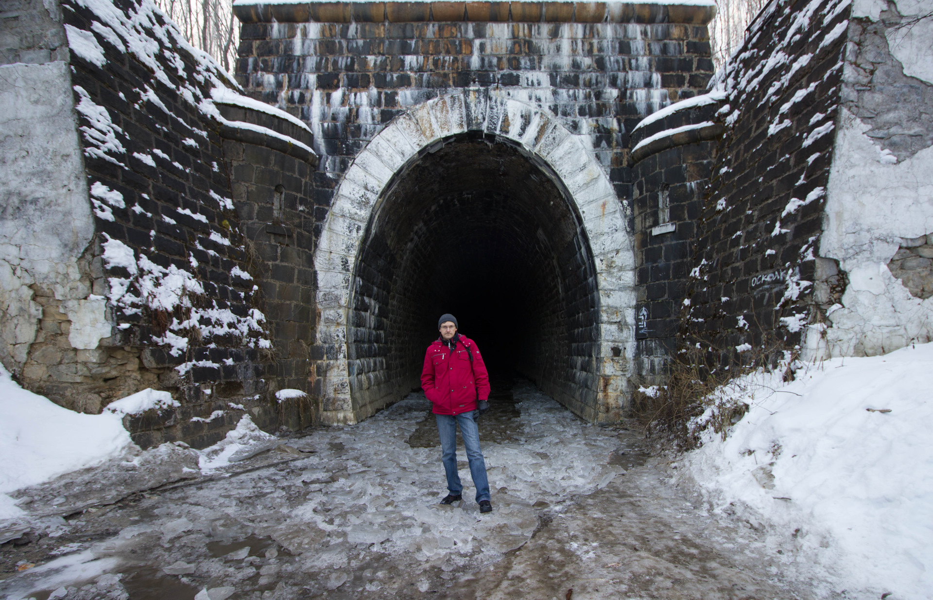 С восточного входа в тоннеле стоит вода, пройти без сапог не возможно, глубина не большая. У входа наколот лед автомобилями выезжавшими ранее из тоннеля. Ну рас кто-то выехал, значит и мы проедем — Едем в туннель.