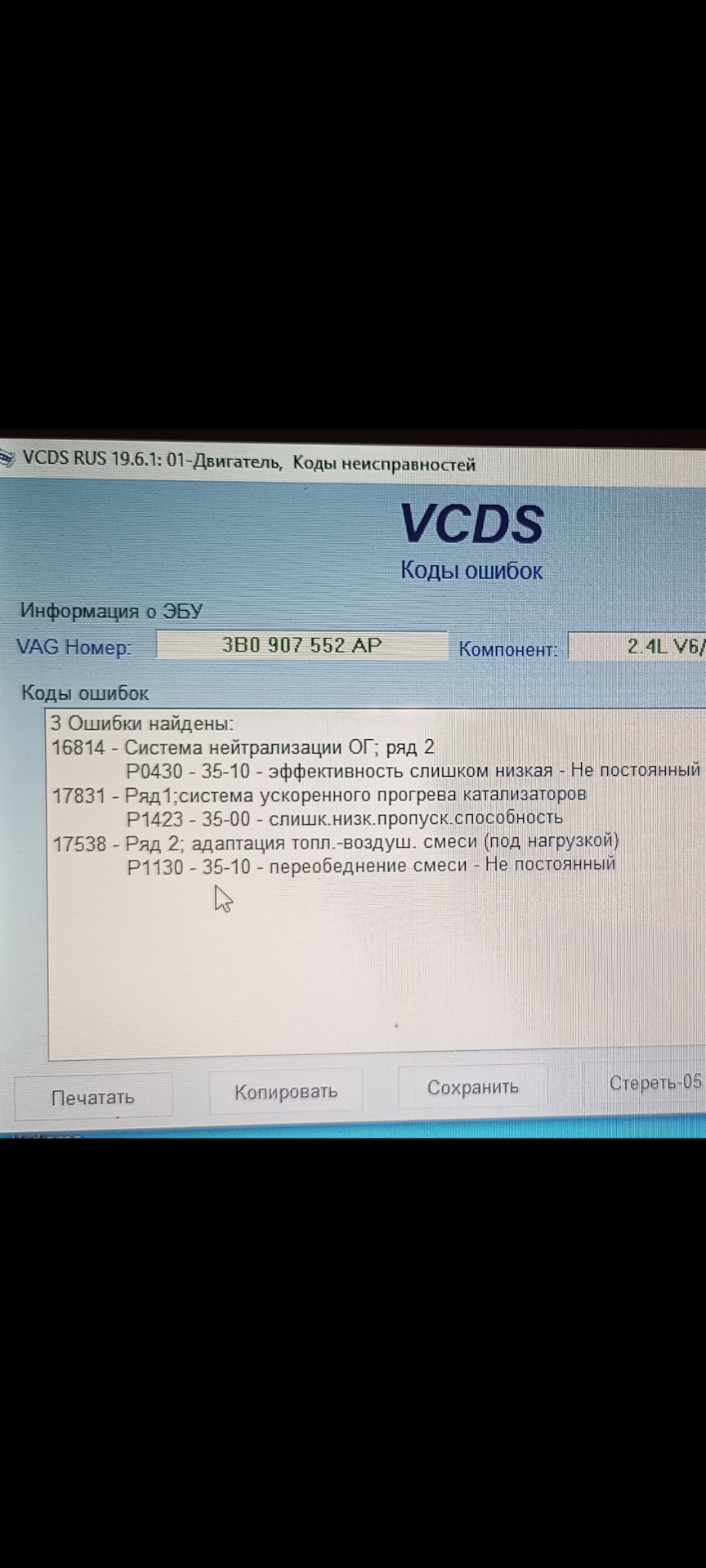 Привет, отличная работа! Подскажи пожалуйста, у меня тоже ошибки по двигателю p14-11 14 -23 a6c5 мотор 2,8. Один умный человек сказал, что забиты у меня катализаторы, я купил промывку для катов, — температура в катах должна быть до 380 градусов, и меня 410, после второй промывки температура почти стала в норме -490 градусов, машина на холодную заводится очень плохо. А с подогревом двигателя очень легко, ошибка тоже то вылезает то нет, вот думаю может дело и не в катализаторе во все