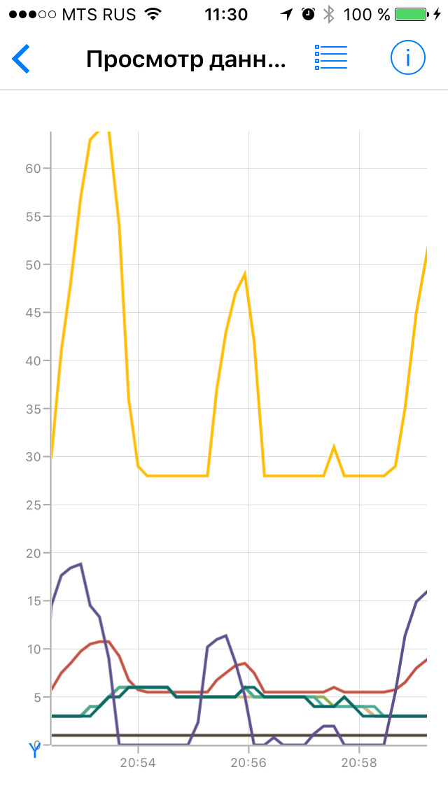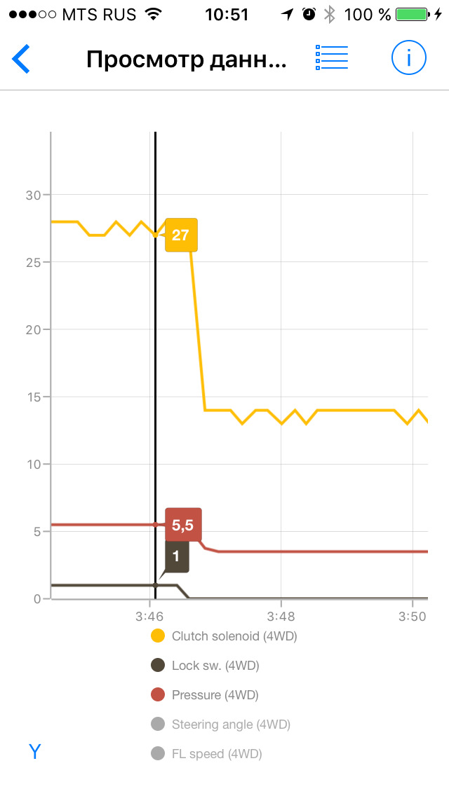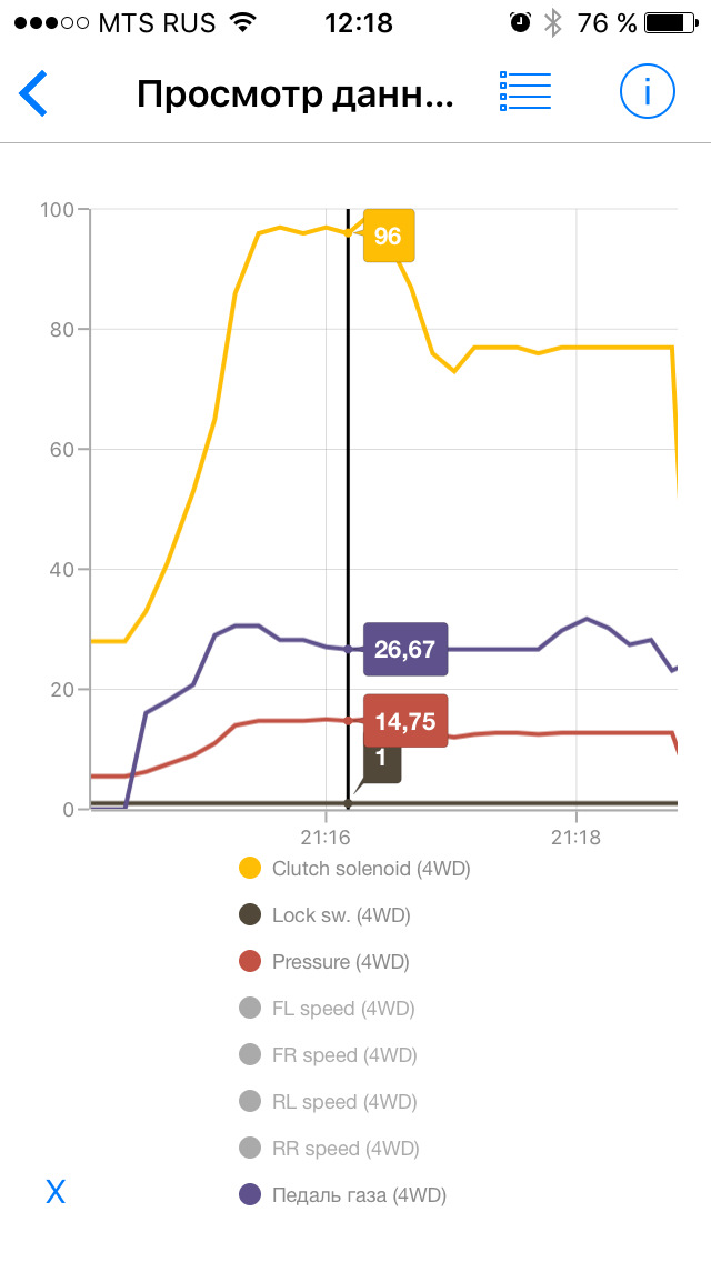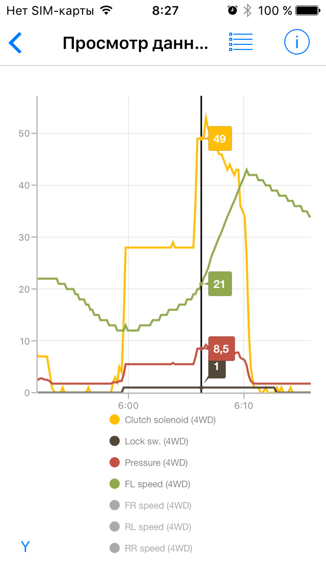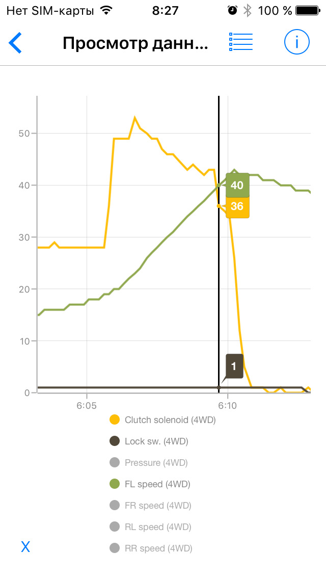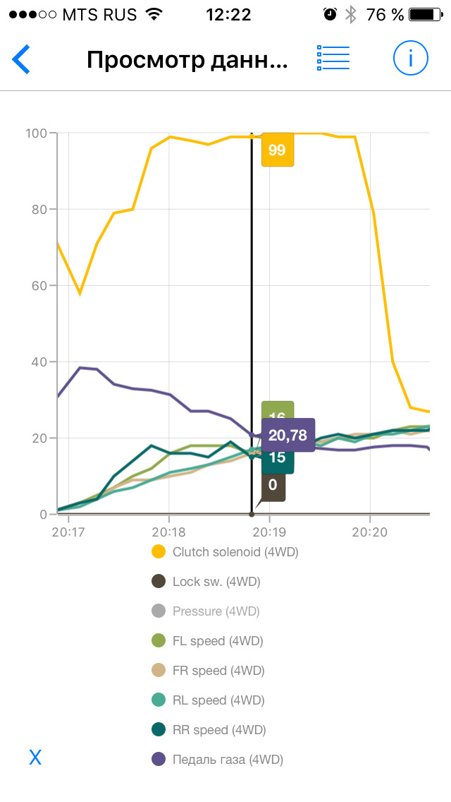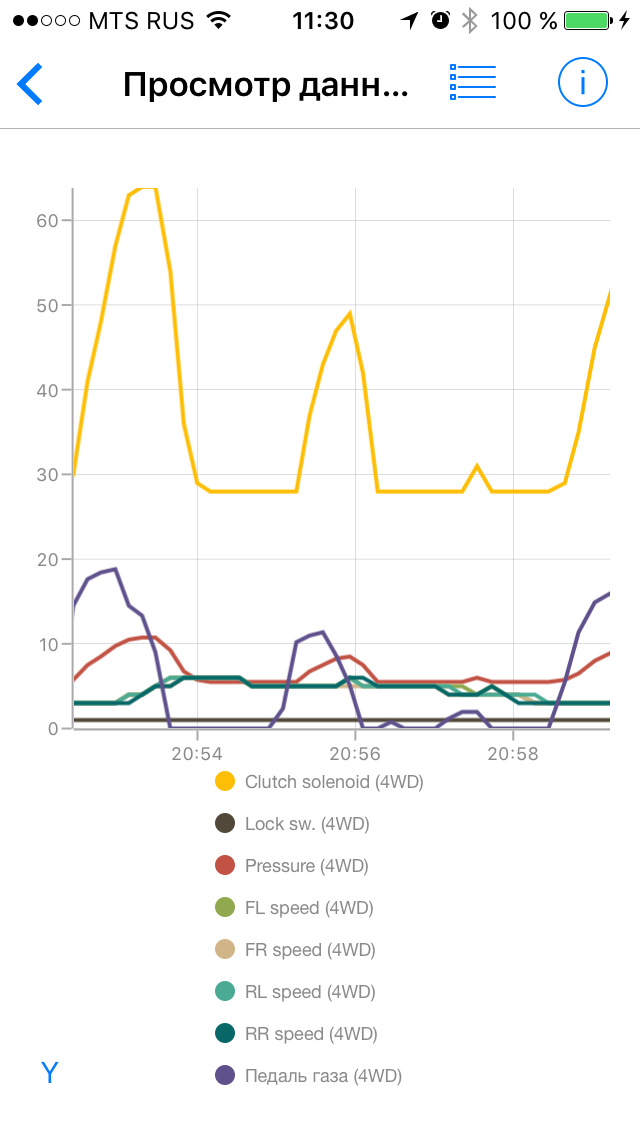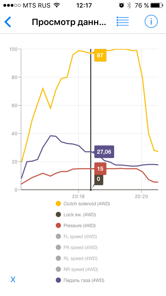 Все наблюдения за работой полного привода я веду с использованием программы Car Scanner ELM OBD2 для iOS и адаптера ELM327, купленного на eBay примерно за 900 рублей. Все скриншоты сделаны при просмотре записанных данных на стареньком iPhone 5.