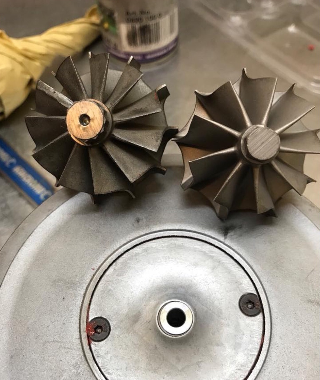 Ну с турбинами не просто, но и сложностей особых нет. Подходят 2 Гаррета с небольшой переходной вставкой, благо токарь есть- приложил фото переходника под компрессор) а до их раскрутки электронный комперссор, он на полную мощность после 0,75 выходит)