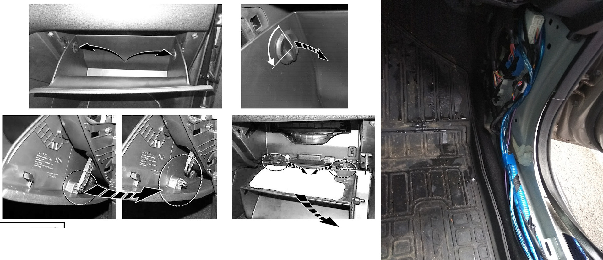 Делаем как на фото, снимаем бардачек и обшивку порога и пластик возле дверных петель.