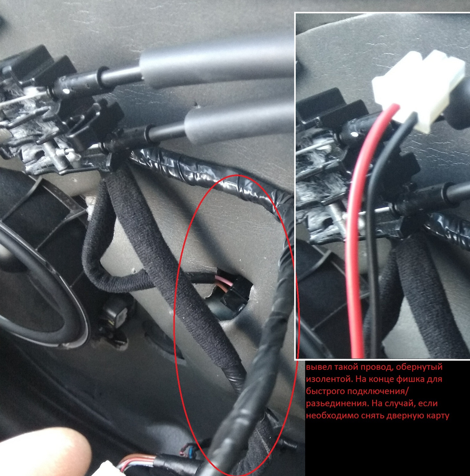 И тянем провод от бардачка (пока не подключаем чтоб не коротнуть на кузов). Тянем через одну фишку — через другую, заводим в дверь и выпускаем на дверную карту, как на фото. Конечно везде приматываем изолентой, хорошо изолируя. Провод ведь плюсовой а корпус авто- минус. Нигде не должно быть проблем.