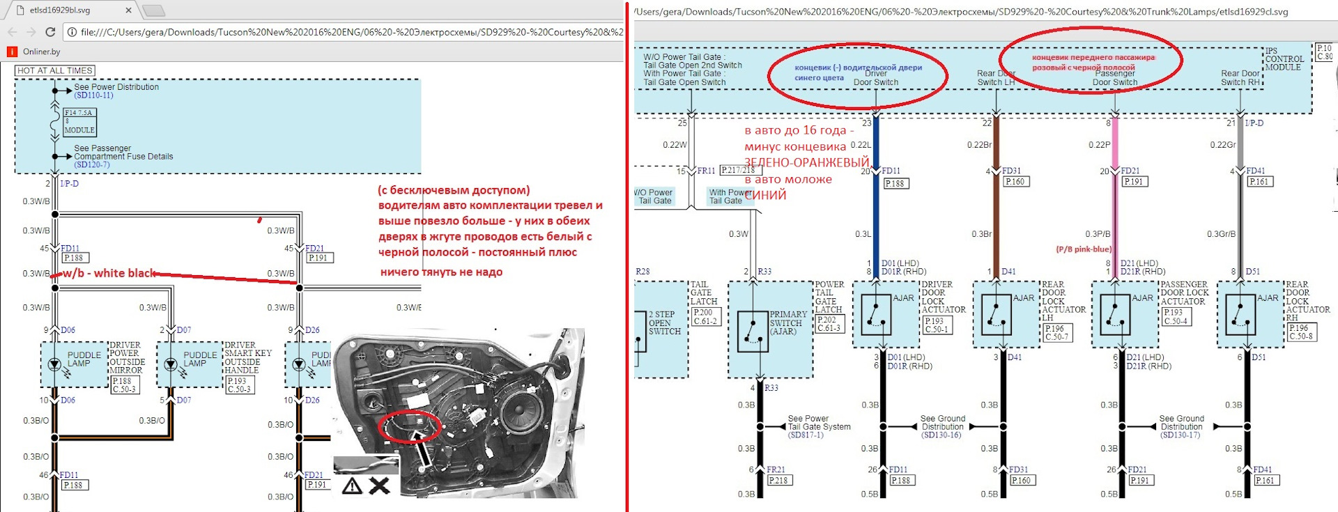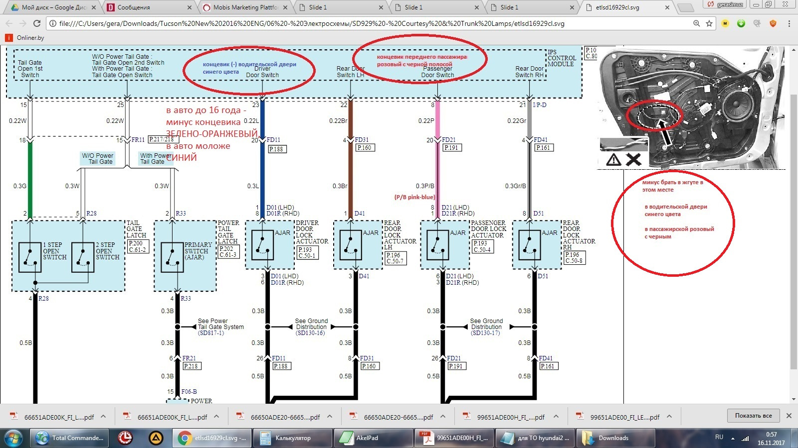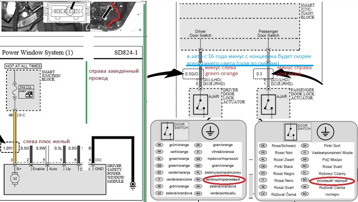 Приведенная схемя для авто 16 года. Судя по схеме в водительской двери минус будет синего цвета. Но у меня, как и в инструкции mobis минус концевика оказался зелено — оранжевый.