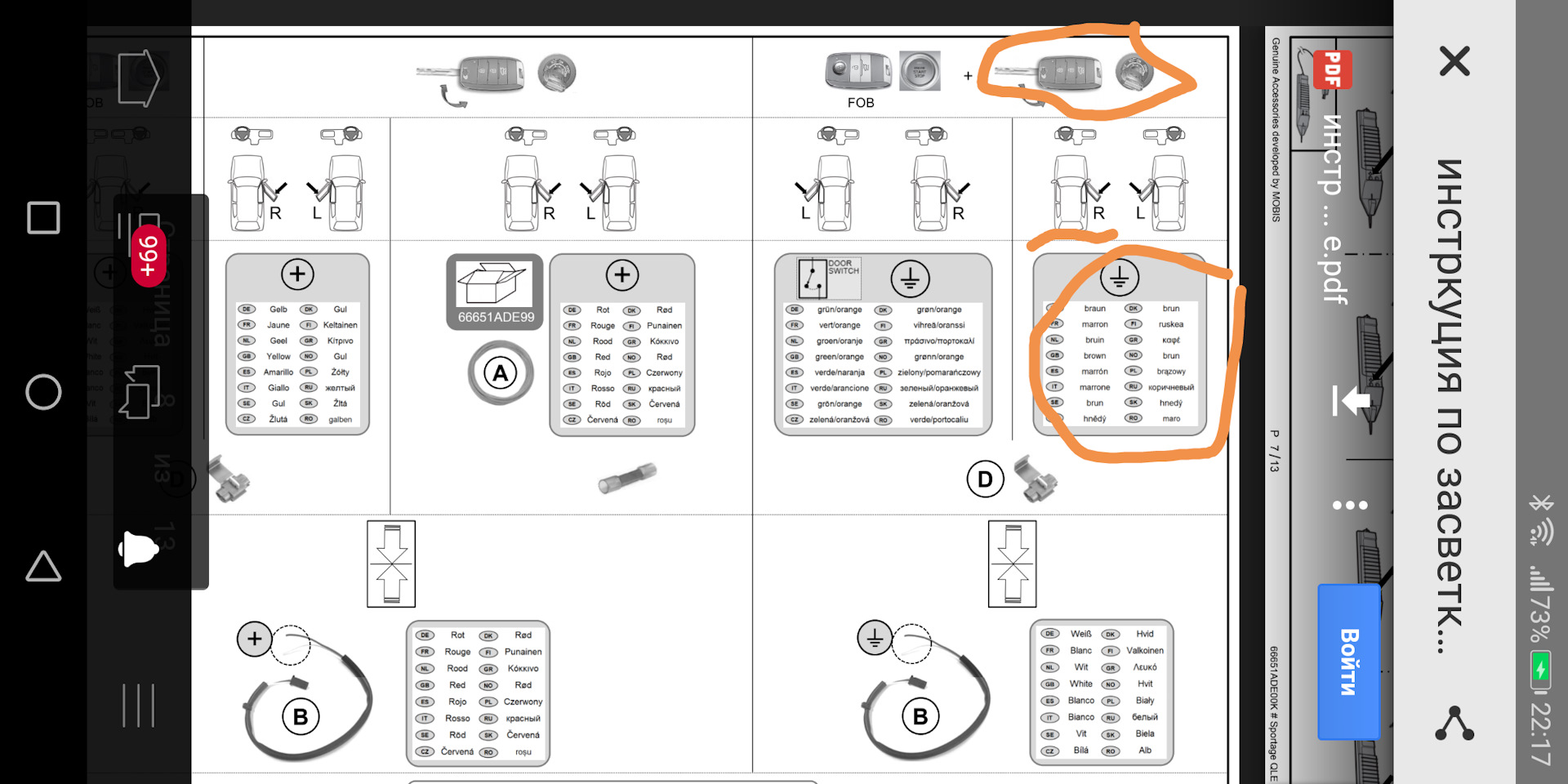 Посмотрел- у вас жало выкидное в ключе и нет безключевого. В пассажирской двери вы плюс ведете от бардачка или плафона, как нарвится. А судя по инструкции, минус у вас все же коричневый