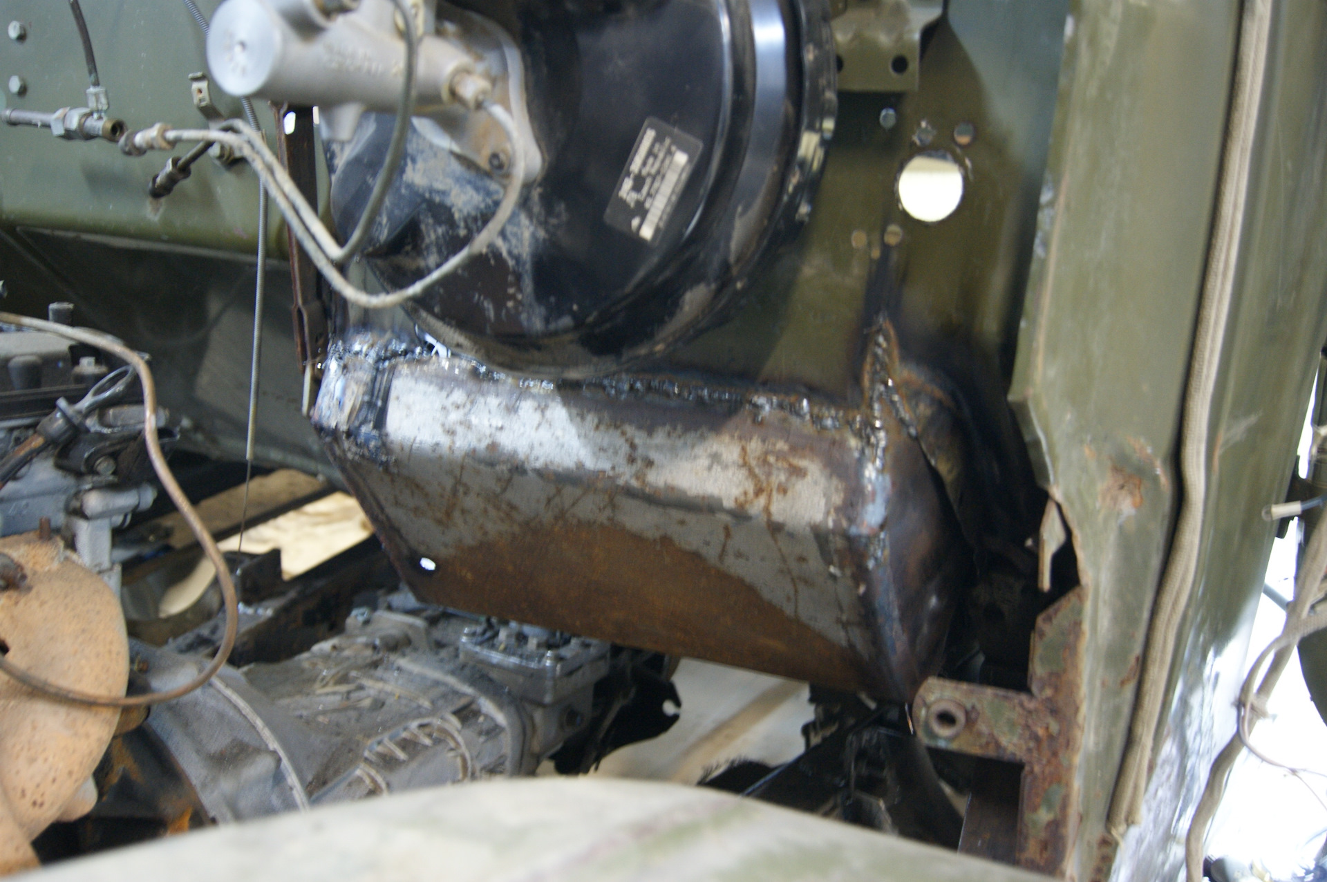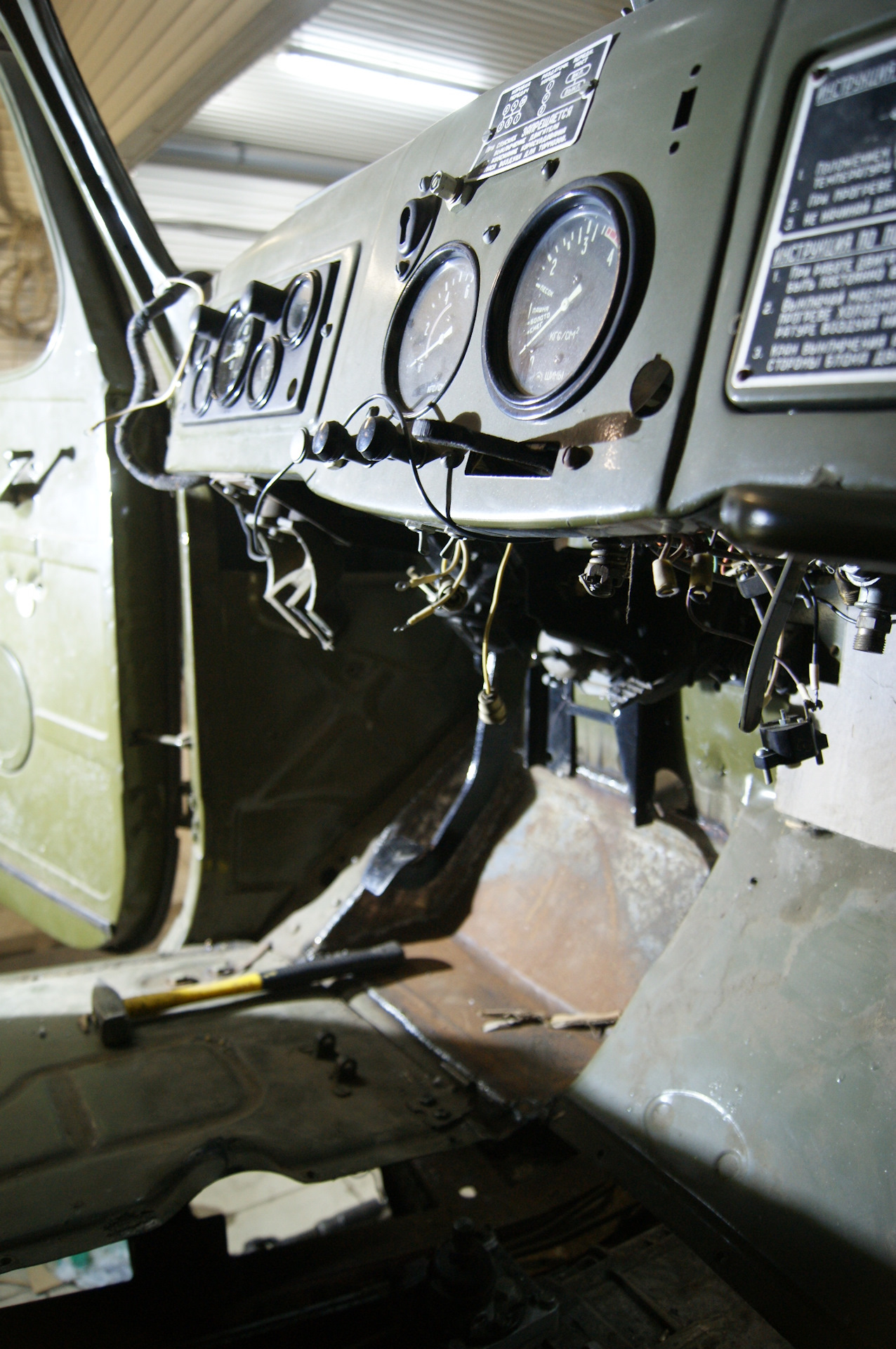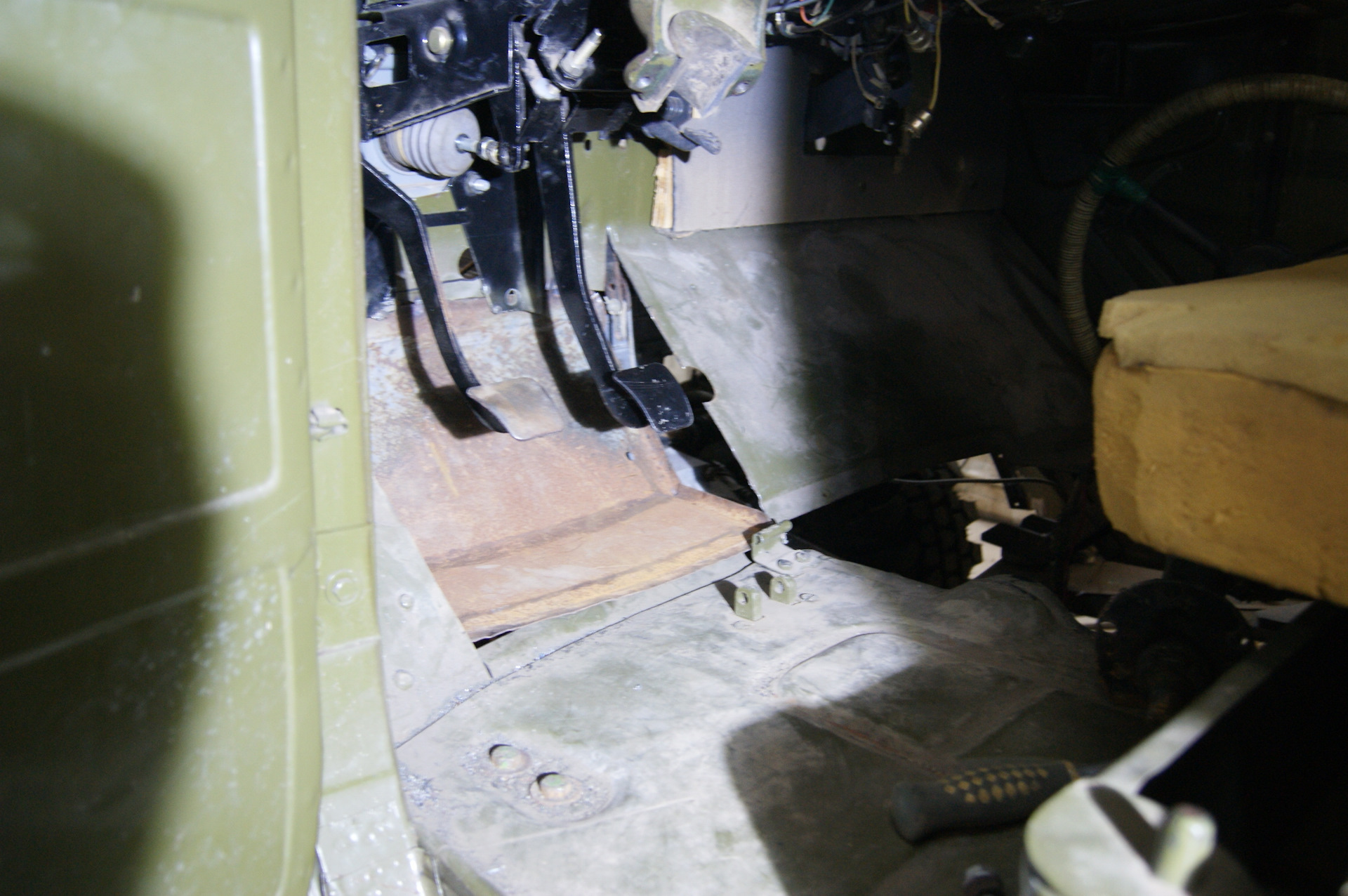 Всем привет! Итак, вырезанный проём под новый педальный узел нужно было чем-то закрывать. Бродил по двору в поисках подходящего куска металла и наткнулся на крышку от большого ящика под рубильник. Как ни странно, но крышка идеально подошла по размерам, её даже пилить не пришлось! Выпрямили там, загнули под нужным углом здесь, и бывшая крышка стала куском пола, причем, мы как будто специально выпилили проем в полу именно под её размеры! И таких совпадений за время строительства машины было предостаточно! Боковые заглушки для ниши делали из крышки от старинной бочки, все же какие раньше были они толстенные! Ну а с электронной педалью газа вообще вышло случайно…Я прикинул её к полу (хватит ли места, будет ли удобно нажимать на неё), а Димка уже принес три шпильки, чтобы их приварить к щиту кабины. Пока он варил, я вертел в руках штатную педаль газа ЗиЛа…а что если установить и её? Сказано-сделано, педаль встает на штатное место и давит на электронную, от которой пришлось отпахать одно ухо и часть корпуса.