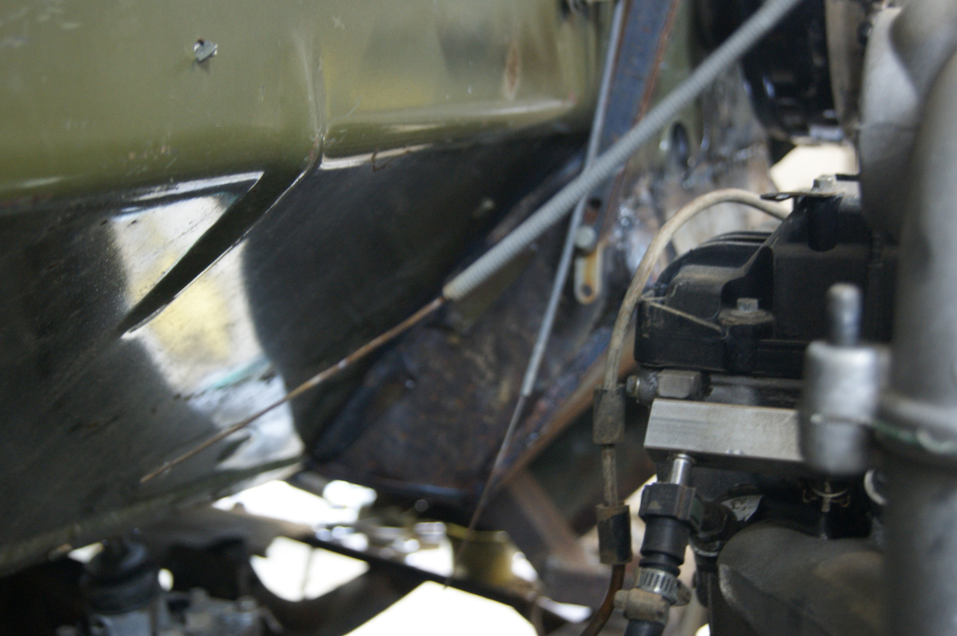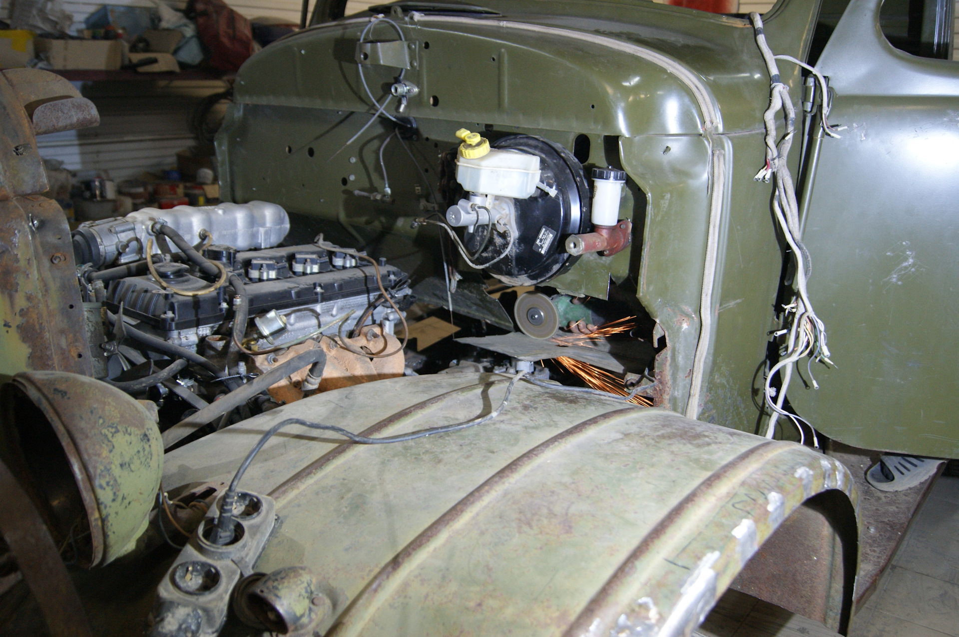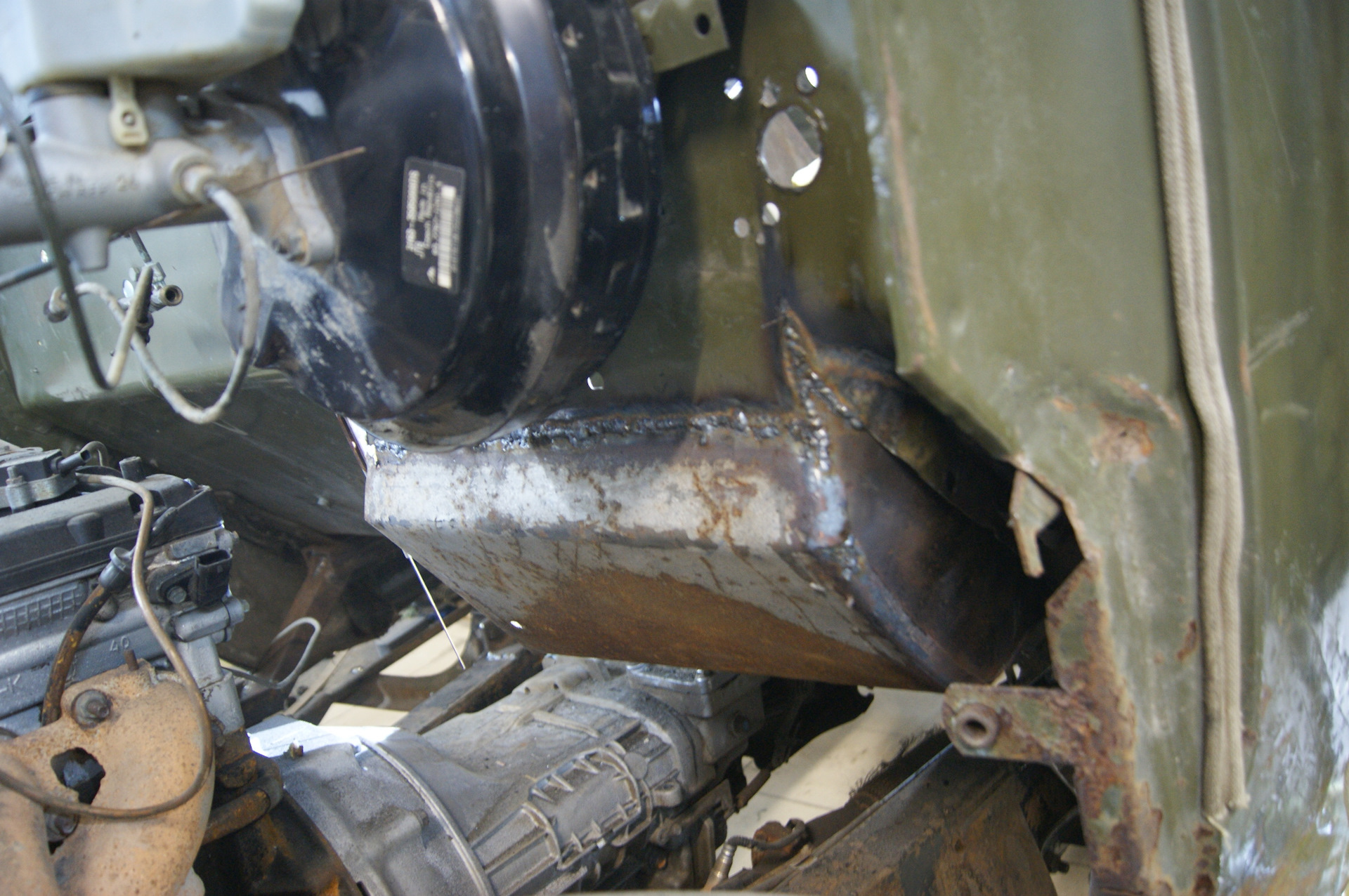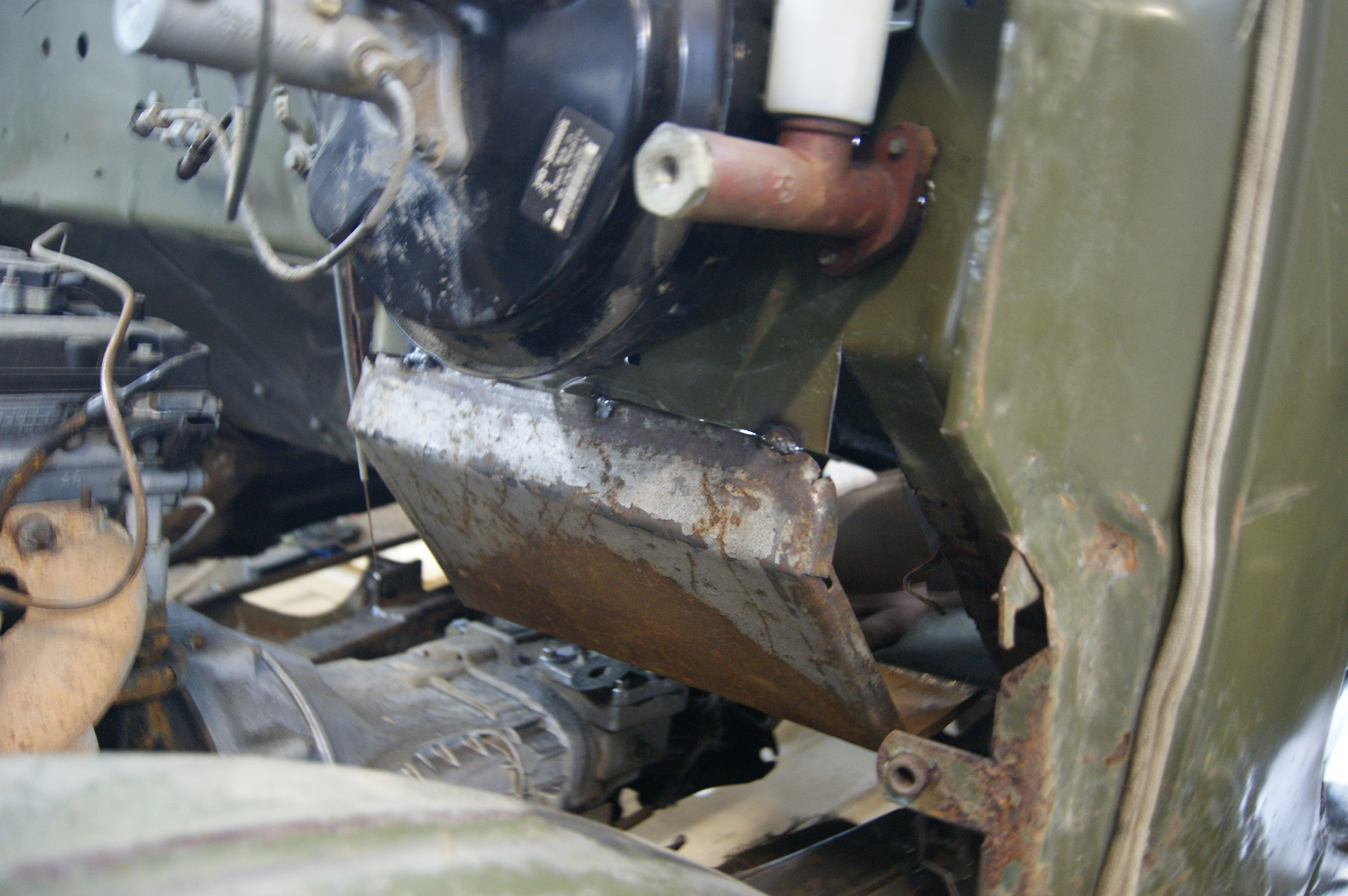 Всем привет! Итак, вырезанный проём под новый педальный узел нужно было чем-то закрывать. Бродил по двору в поисках подходящего куска металла и наткнулся на крышку от большого ящика под рубильник. Как ни странно, но крышка идеально подошла по размерам, её даже пилить не пришлось! Выпрямили там, загнули под нужным углом здесь, и бывшая крышка стала куском пола, причем, мы как будто специально выпилили проем в полу именно под её размеры! И таких совпадений за время строительства машины было предостаточно! Боковые заглушки для ниши делали из крышки от старинной бочки, все же какие раньше были они толстенные! Ну а с электронной педалью газа вообще вышло случайно…Я прикинул её к полу (хватит ли места, будет ли удобно нажимать на неё), а Димка уже принес три шпильки, чтобы их приварить к щиту кабины. Пока он варил, я вертел в руках штатную педаль газа ЗиЛа…а что если установить и её? Сказано-сделано, педаль встает на штатное место и давит на электронную, от которой пришлось отпахать одно ухо и часть корпуса.