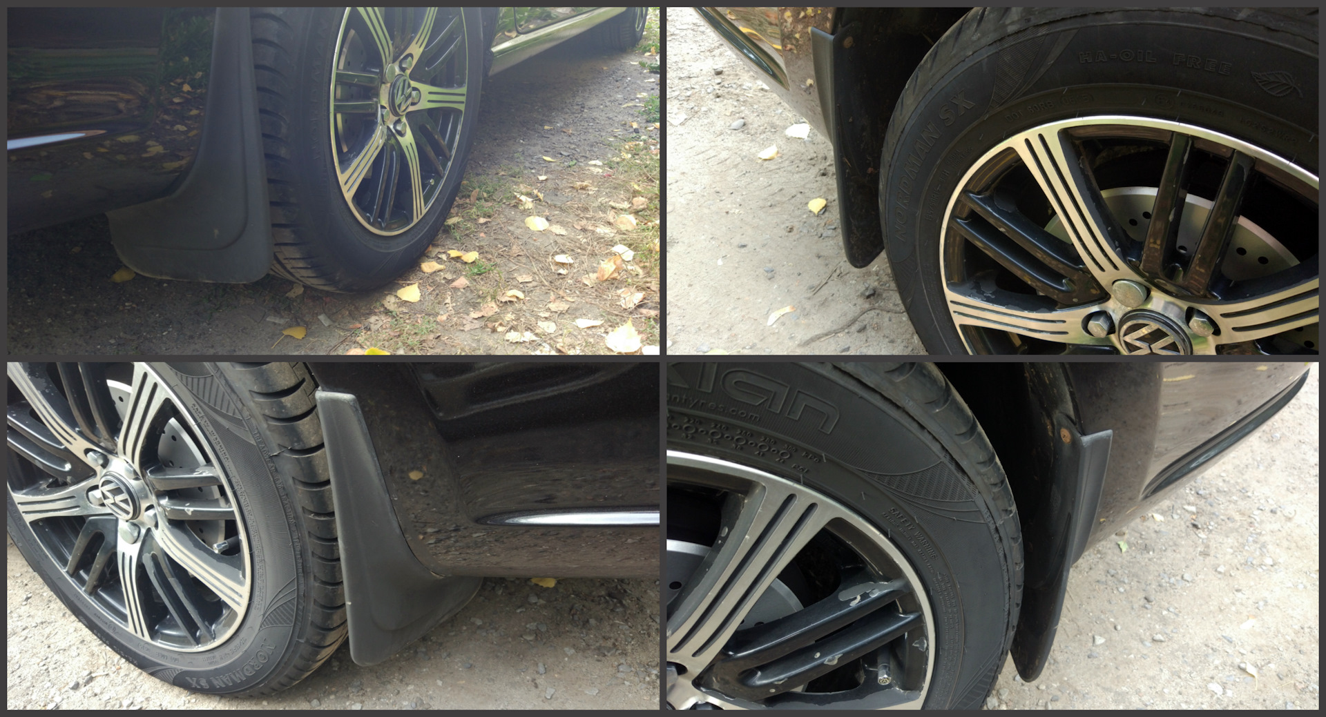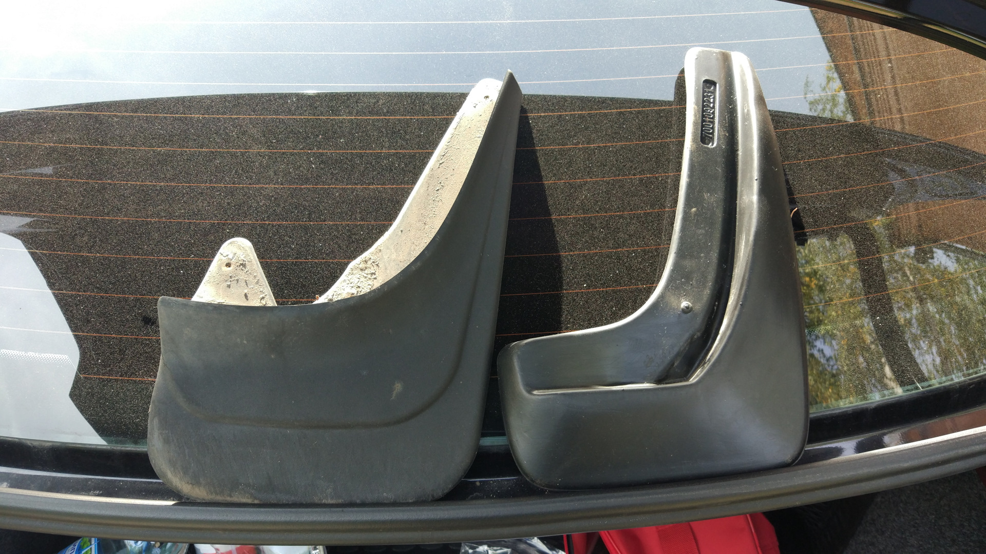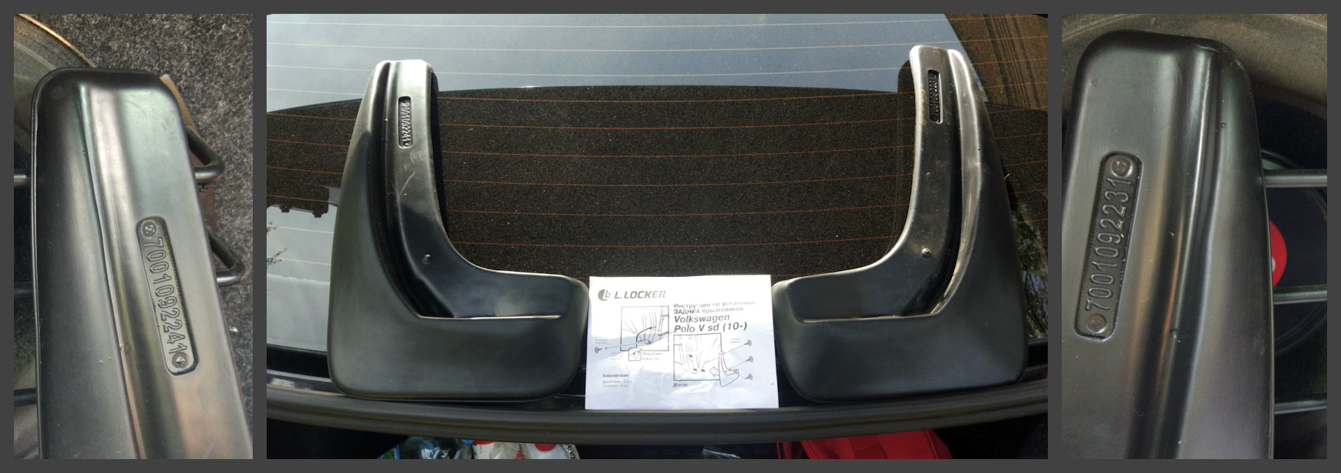 На второй день после покупки машины, в далеком 2012 году, поехал затариваться всякими нужными аксессуарами для этой машины и после покупки магнитолы SONY, остались деньги только на универсальные брызговики ноунейм. Купил, поставил, так и ездил до 2015г, затем сменил передние, т.к. универсальные не подходили по порогу VW.