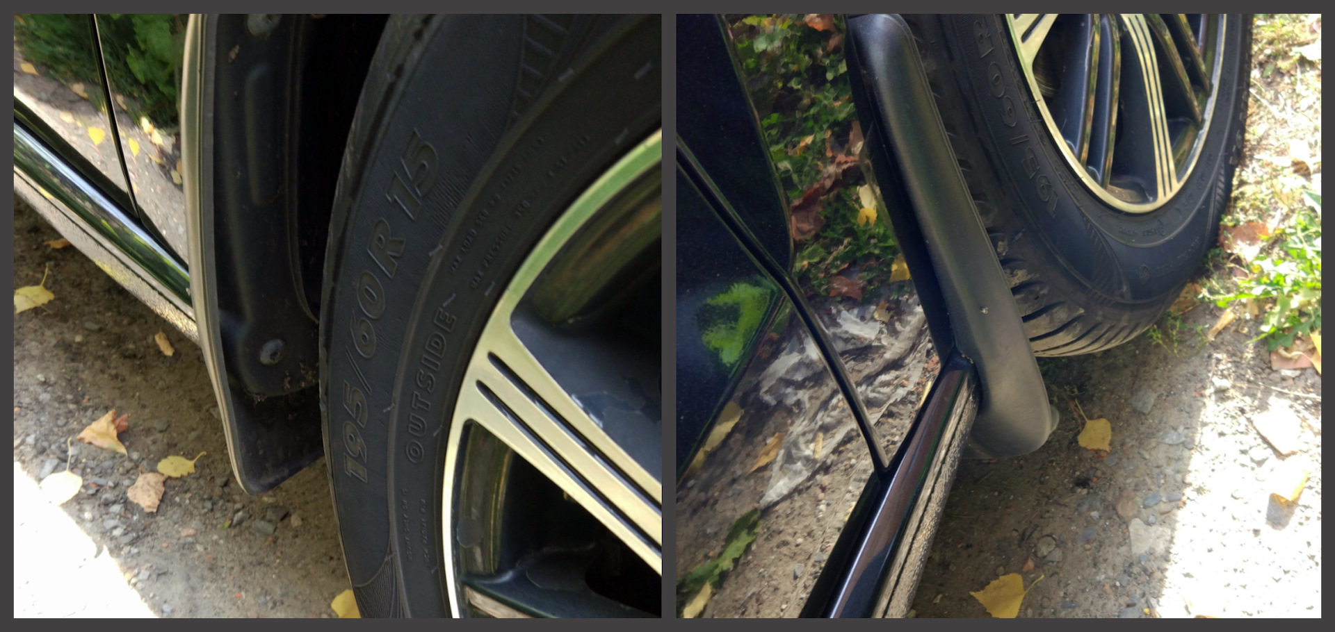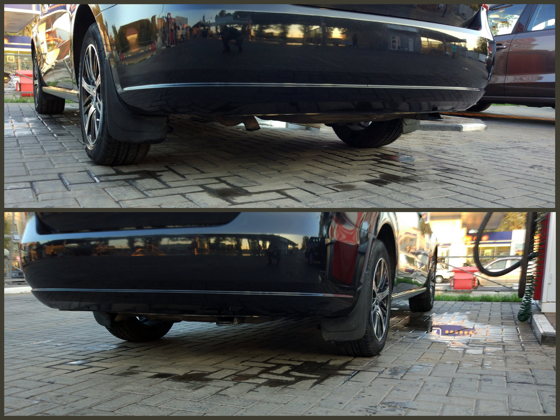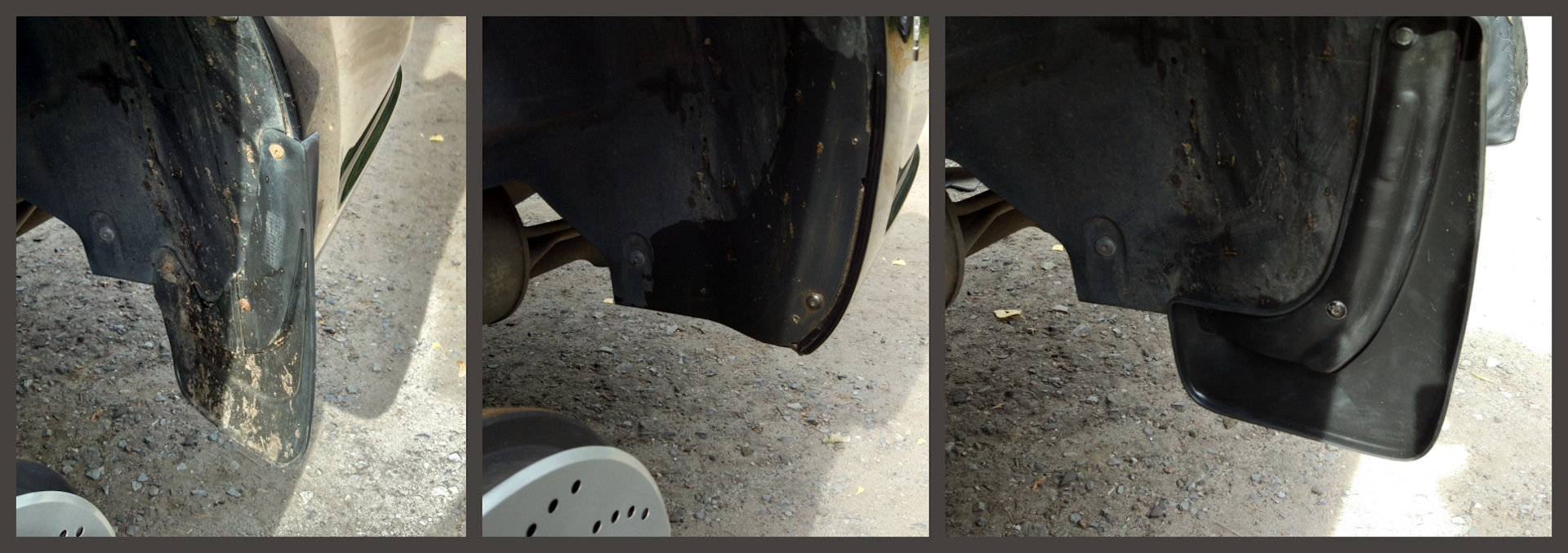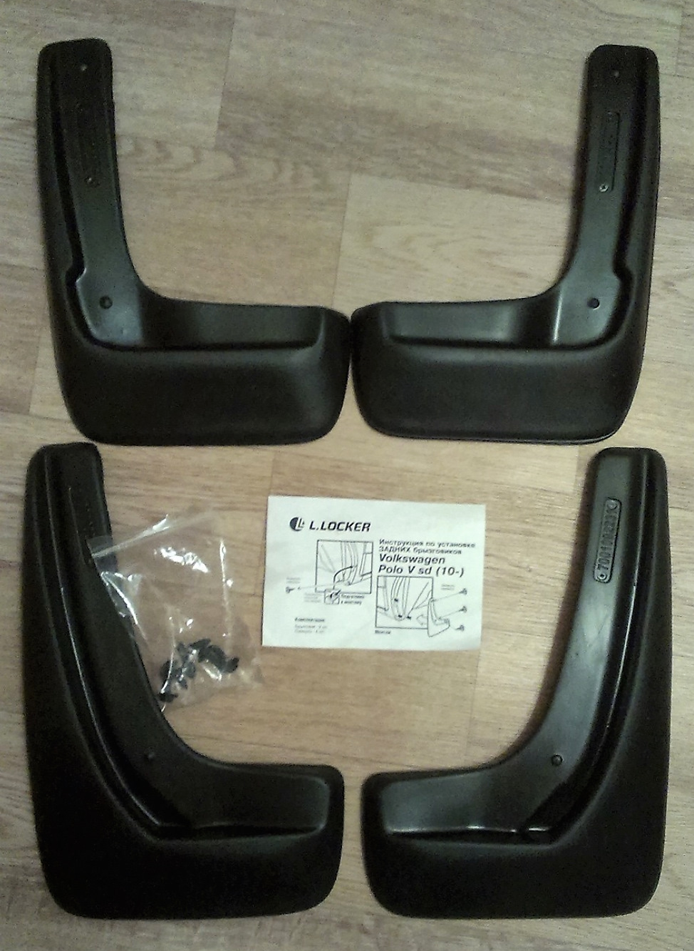 На второй день после покупки машины, в далеком 2012 году, поехал затариваться всякими нужными аксессуарами для этой машины и после покупки магнитолы SONY, остались деньги только на универсальные брызговики ноунейм. Купил, поставил, так и ездил до 2015г, затем сменил передние, т.к. универсальные не подходили по порогу VW.