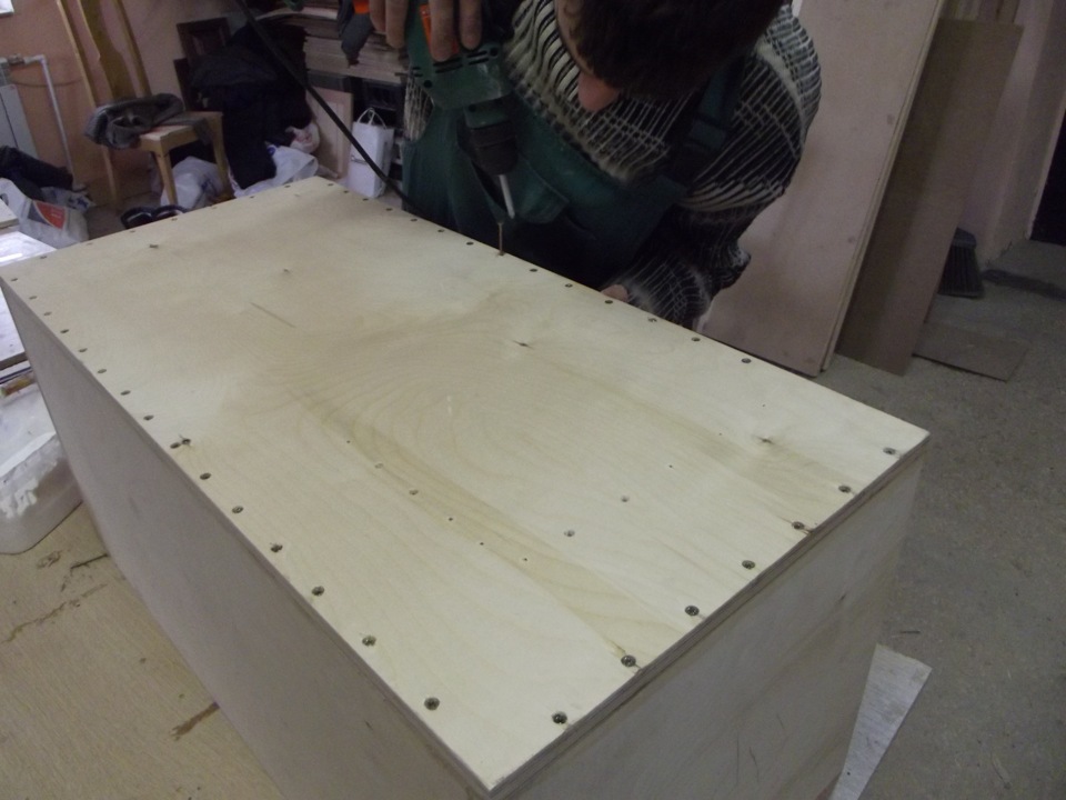 нижняя стенка, саморезы через каждые 5см по контуру саба.