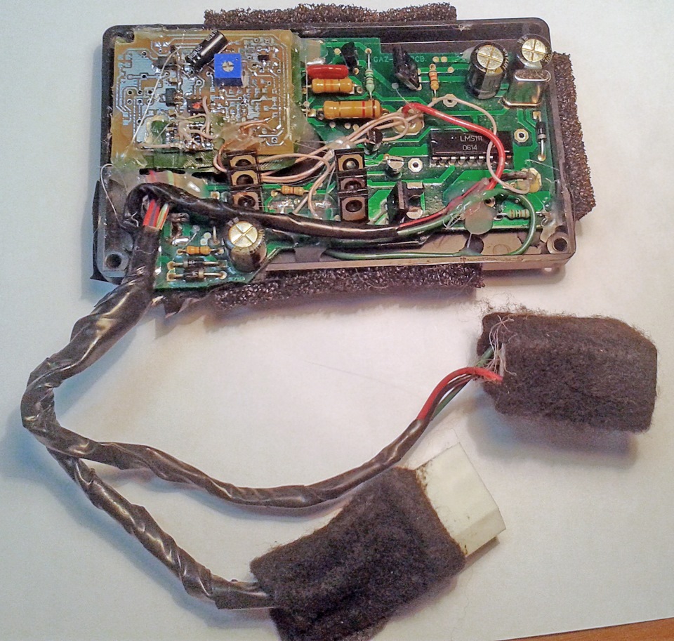 В целом это плата из рижской приборки ГАЗ, с которой сняты собственно механизмы спидометра и тахометра, и спидометр вынесен на проводах-удлинителях (6 штук, первый разъем). Вход от датчика и питание — второй разъем. Внутри установлен мой преобразователь сигнала спидометра, чтобы показания были корректными при установке любого ДВС, АКПП, главной пары. .