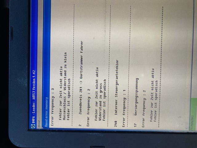 Еще с покупки машины на приборке горел беременный мужик — ошибка по подушкам безопасности. Ситуация стандартная до жути, еще не одной е39 не видел без этой ошибки. В прошлой записи написал, что попробовал прочитать блок на ошибки и выяснилось, что в нем сидит внутренняя ошибка 240, плюсом он постоянно отваливается от диагностики, значит он совсем мертвый. Стоит заметить, что в передней правой двери подушка безопасности была заменена кем — то из предыдущих хозяев. Погуглив интернет было выяснено, что ошибка 240 — появляется при ДТП, это нечто типо краш даты и на старых блоках MRS3 путей решения два: замена блока или прошивка, заключающая в себя заливку в процессор блока дампа не аварийного блока.