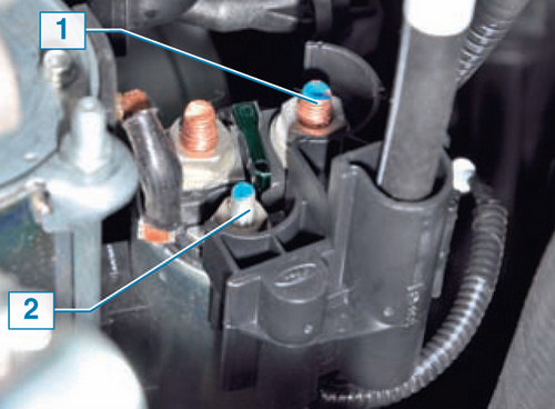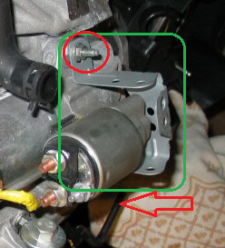 Сам стартер прикручен к блоку двигателя двумя болтами, на шляпках которых есть шпильки для крепежа под проводку который нам первоначально и необходимо снять.