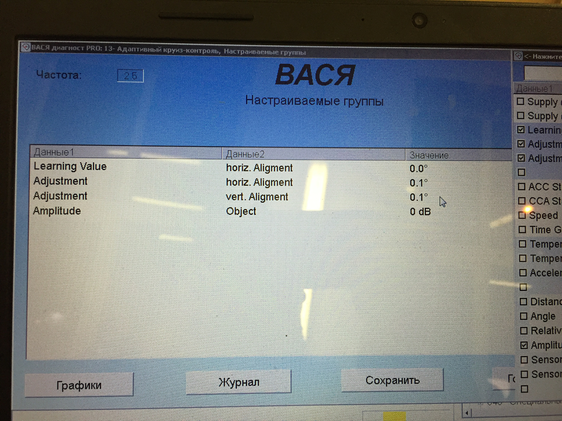 Неправильное заключение о том, что зеркало на радаре не используется для юстировки. Оно как раз для этого и используется, весть процесс описан в ELSA. Для юстировки нужен специнструмент с лазером и размеченной пластиной (нарисована сетка с шагом 4 мм) и стенд сход-развала, по отражению лазерного луча от зеркала выставляется радар, луч должен отражаться в определенные координаты пластины. Данные которые на фото в измеряемых группах радара, это фиксированные значения (координаты), под которые нужно подогнать отражение лазерного луча. Значения в измеряемые величины записываются на заводе, после проверки на стенде определяется угол отклонения зеркала от излучателя и записывается в радар, эти значения в всех радаров разные.