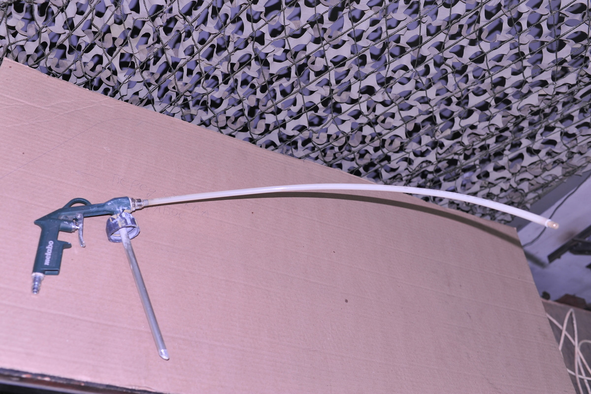 А это пневмо пульверизатор (прикручивается на стандартный евро-баллон), им я обрабатывал полости правого переднего крыла. Длина хобота у него примерно 700мм, на конце распылитель, который распыляет смесь в 3 боковых сопла и 1 по центру (для моих нужд самое то):
