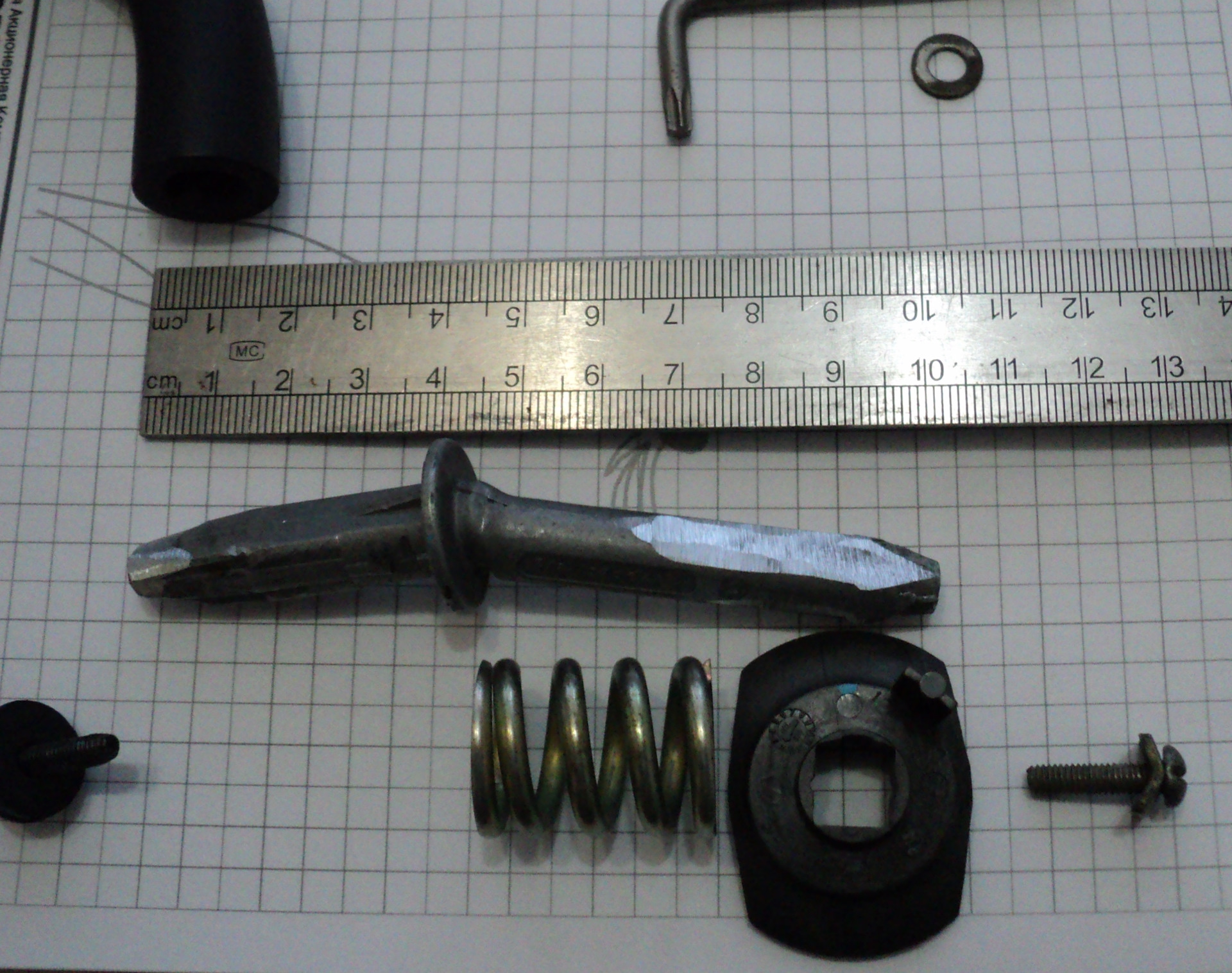 Разбираемся в конструкции самостоятельно… Сам поводок ручки сделан симметрично относительно опорного кольца пружины. Этим и воспользуемся… Та сторона, которая держала зеркало, в силу такой конструкции должна иметь изначальную длину. А вот противоположная, к которой крепится ручка, может быть и покороче.