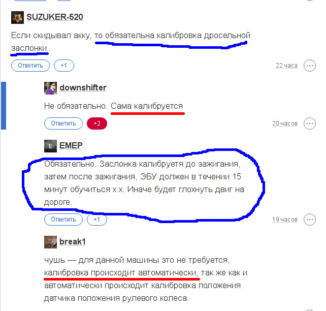 Началось с того, что некоторые утверждали о необходимости какой-то особой процедуры калибровки дроссельной заслонки после скидывания клемм с акб, которая встречается на некоторых других авто с определенной последовательностью действий. А другие им отвечали, что калибровка происходит автоматически. И все это всего лишь пару сообщений выше.