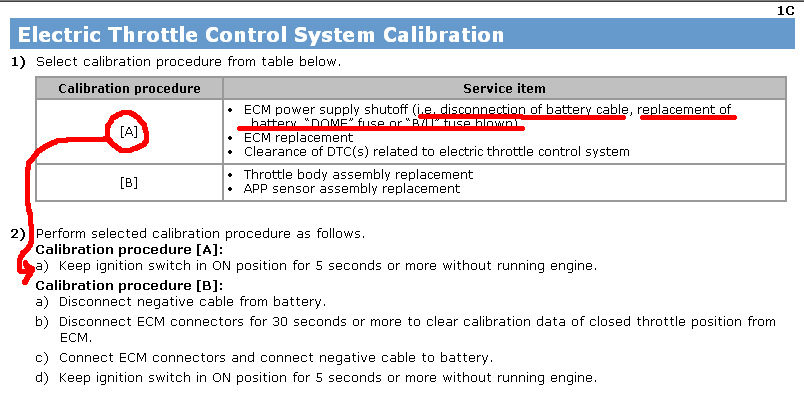 Читаем внимательно — во всех случаях кроме замены дроссельной заслонки и замены педали газа — требуется пункт А — а именно включить зажигание подождать 5 сек не заводя двигатель. В том числе и при снятии клемм АКБ, замене ЭБУ, замене АКБ и т.д.